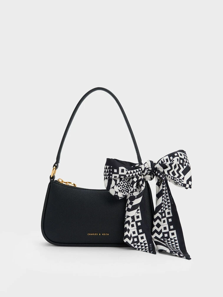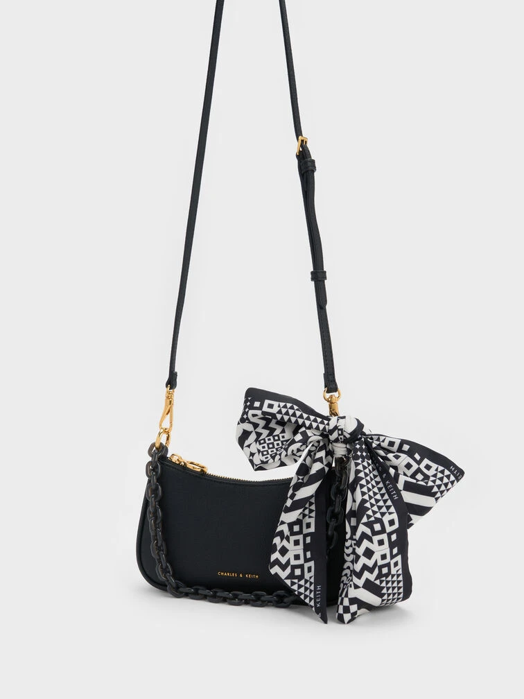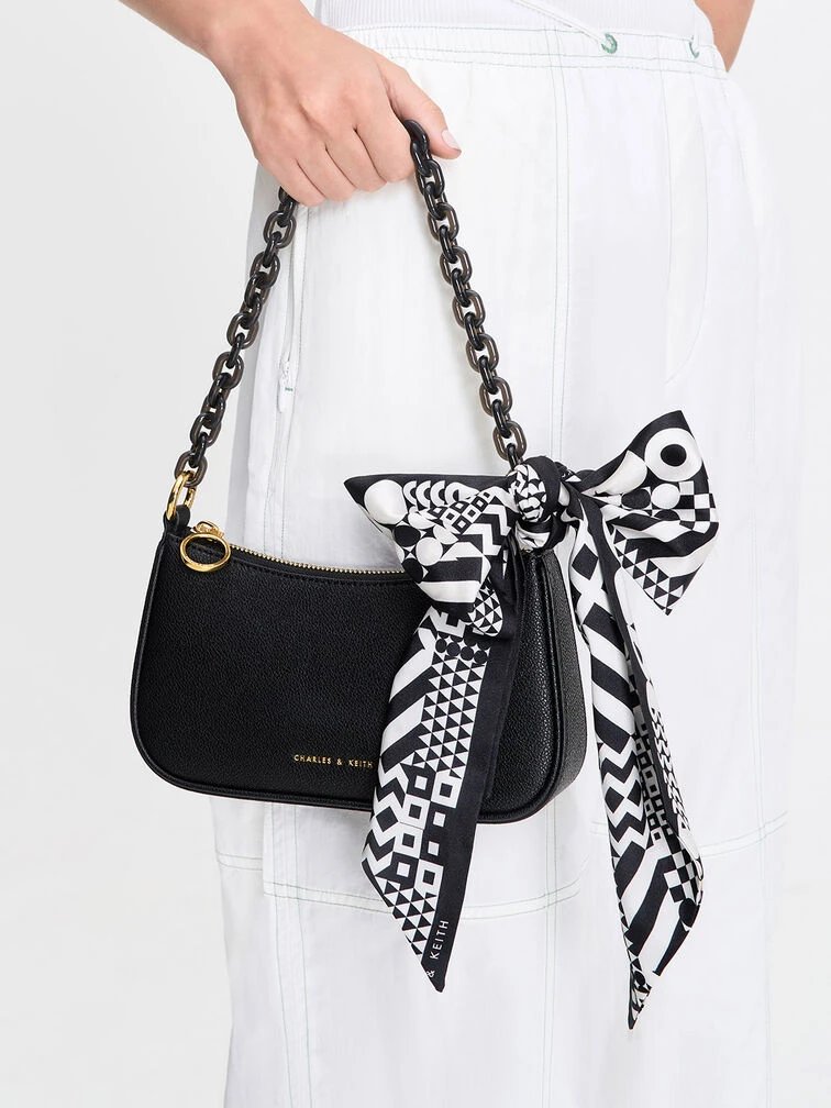 With a bold patterned scarf knot and sleek baguette silhouette, the design elements of the Alcott shoulder bag sets this accessory apart from the rest. In classic black for a timeless appeal, this eye-catching bag strikes the perfect balance between sophisticated and practical. With a chunky chain-link embellishment that can double as a handle, switch up your style with ease with this cool carrier in tow.