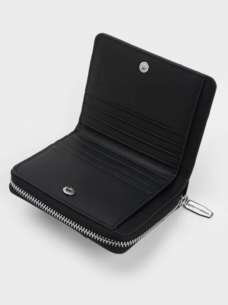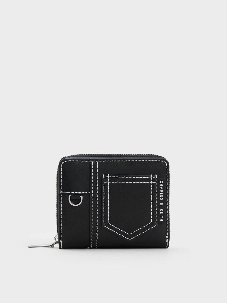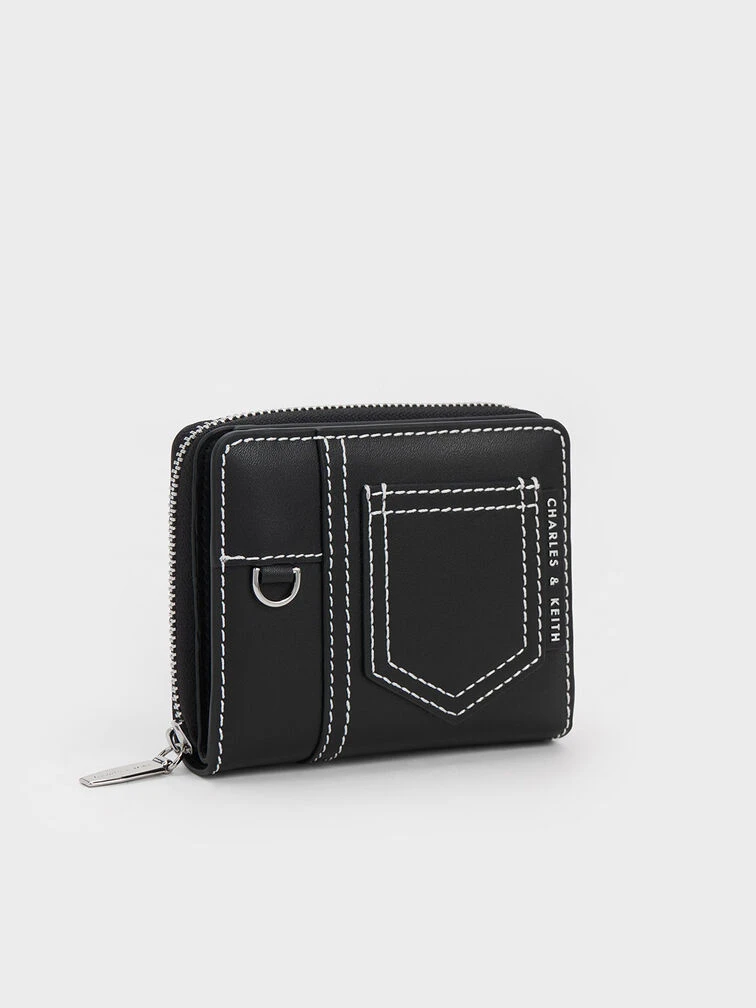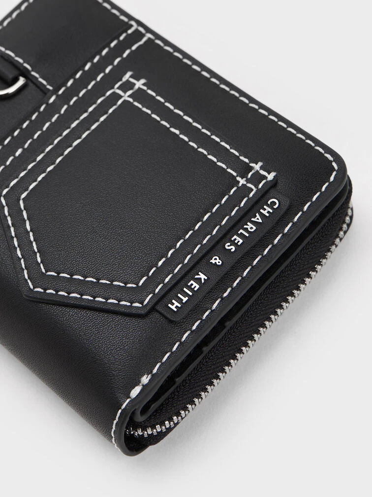 Upgrade your everyday wallet to the playful and practical Anthea zip-around wallet. With its convenient zip-around closure, this accessory ensures easy access to multiple slots and compartments, keeping your cash, cards, and curios perfectly organised. One of the standout features of the Anthea zip-around wallet is the eye-catching white contrast-stitch trim against the sleek all-black finish. This stylish detail adds a touch of cool and effortlessly elevates any look, making it a perfect choice for fashion-forward individuals.