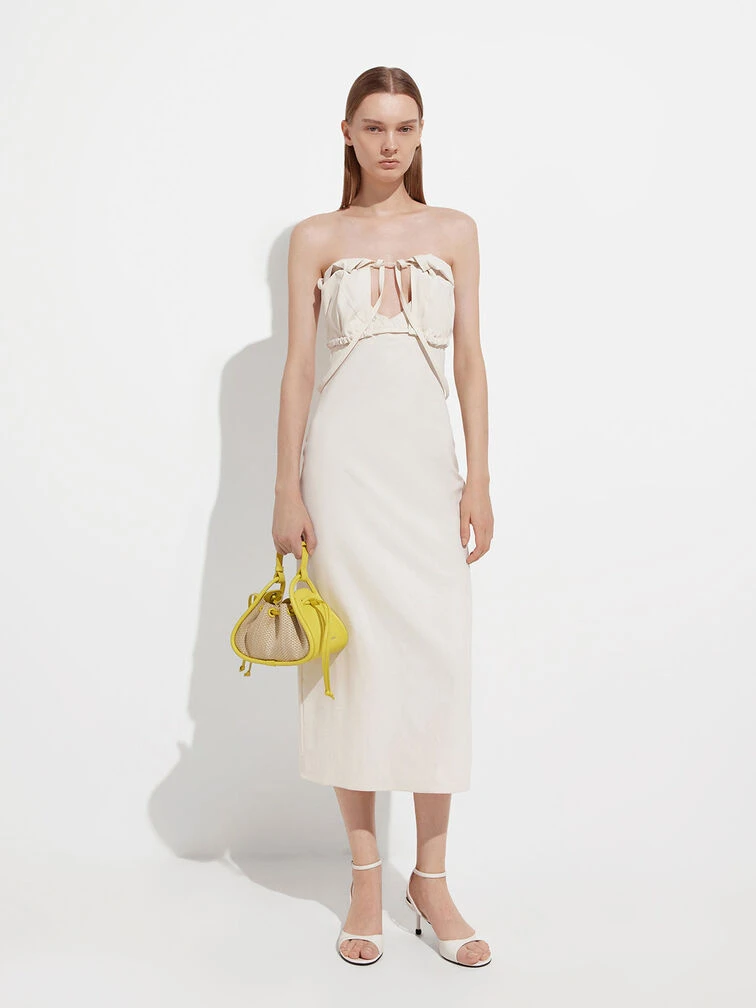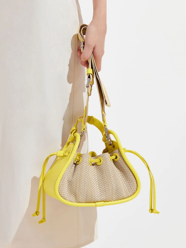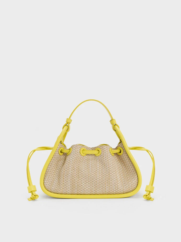 Step into the summer with this impossible-to-miss Ashby bag in tow. With a rustic raffia body that is framed by bold yellow trims, this bag is designed to stand out and be noticed. Featuring an elegant curved silhouette and a handy top handle, it features a drawstring closure that ensures both easy access and security. Pair it with a voluminous white maxi dress and let it shine as the star of the outfit.