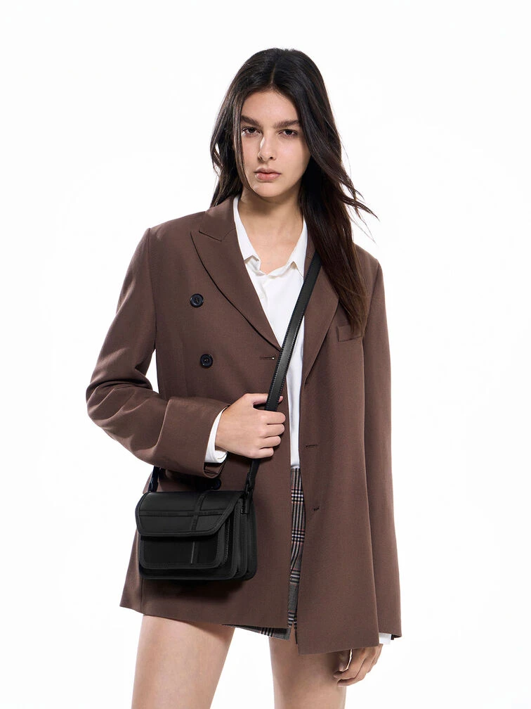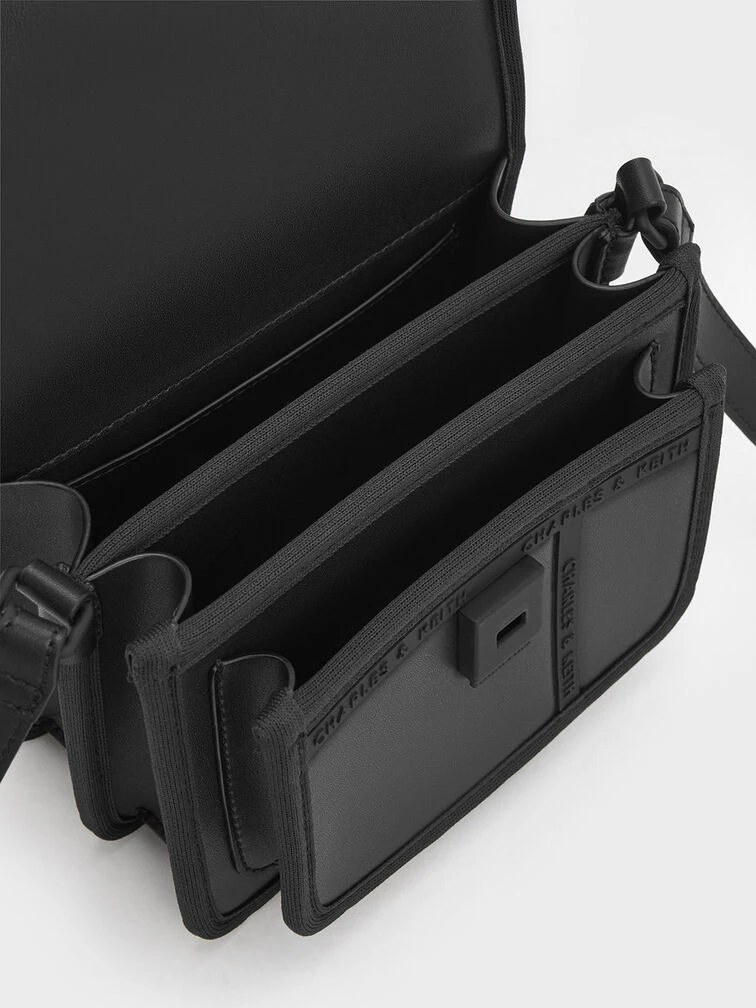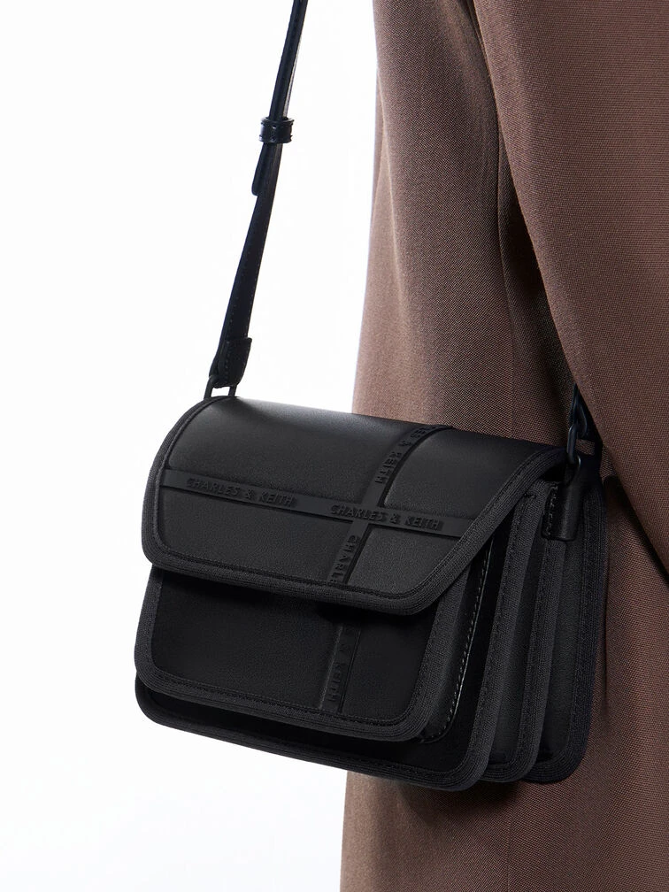 Featuring a utilitarian boxy design and complete with an all-black finish, this Avenue crossbody bag blends form and function with style. It also comes fitted with an adjustable shoulder strap, so you can carry the bag at your preferred drop length. Opening up to reveal two main compartments, as well as a front compartment that is ideal for holding smaller items, you can be assured that all your belongings will be kept neat and organised, with each having its own designated place.