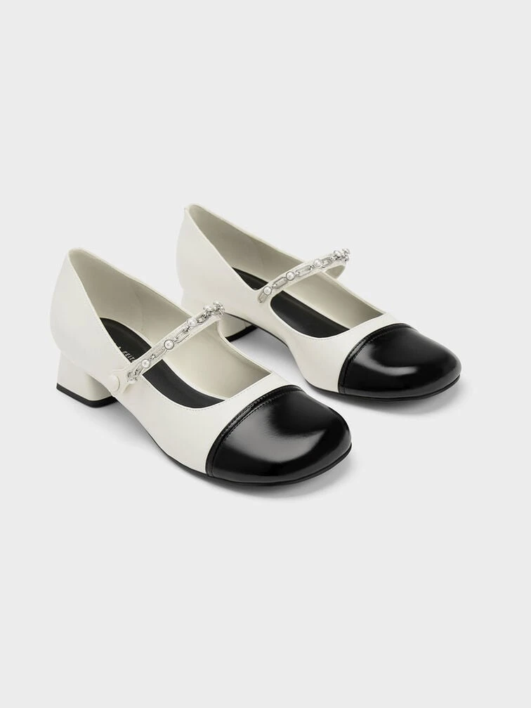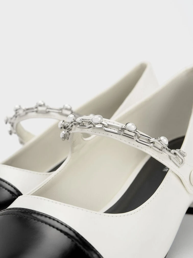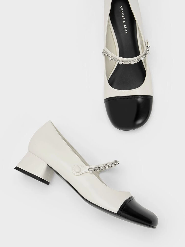 These sleek white Mary Janes come with black toe-caps and chain-links that are adorned with lustrous faux pearls. Set on dependable trapeze block heels, they strike the balance between function and form. Let these statement shoes ground your black-and-white monochrome outfits — we are thinking it will go perfectly with a tweed suit and skirt set.