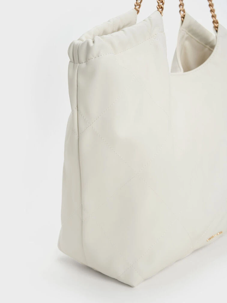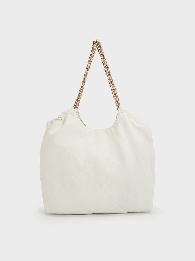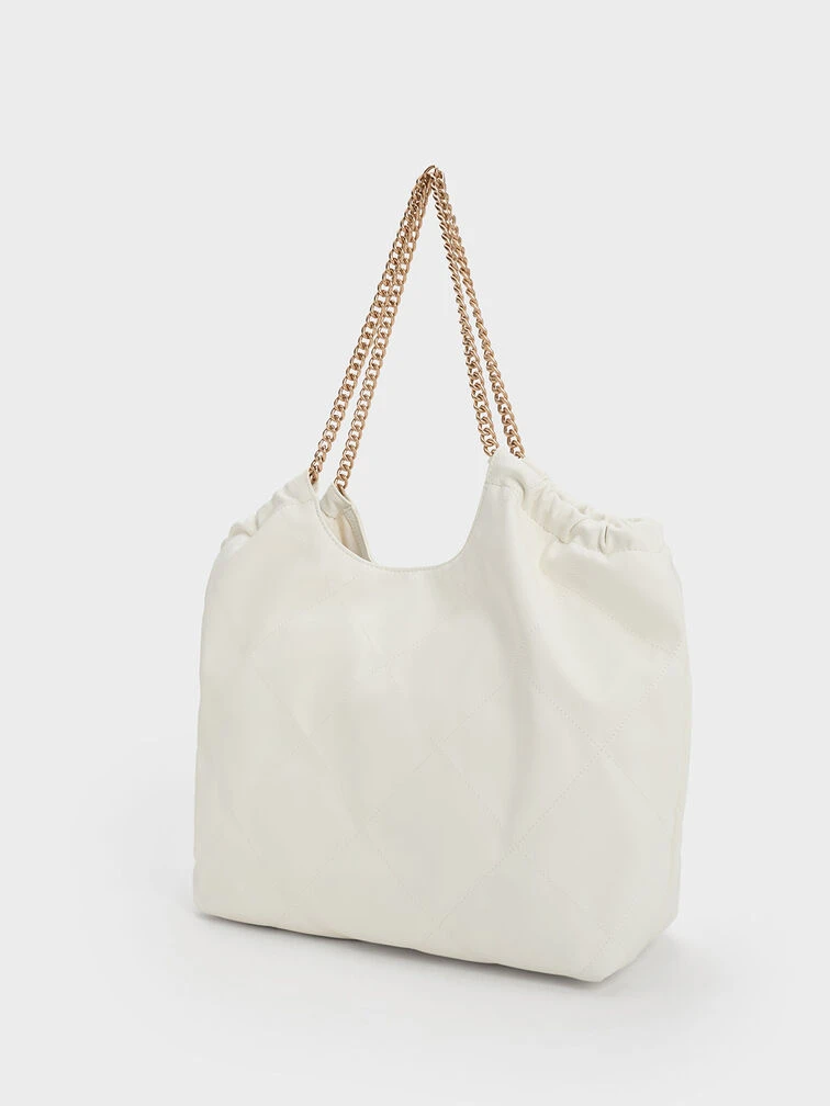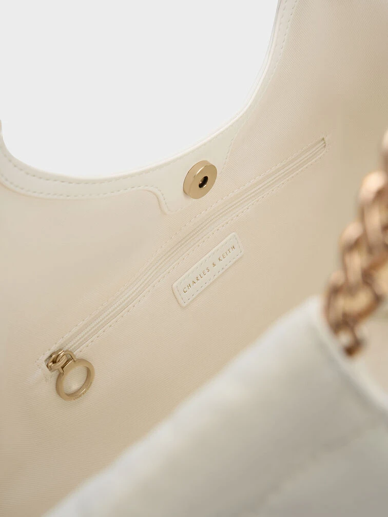 In match-all white, this neutral-toned iteration of our braided handle tote bag will slot seamlessly into your wardrobe rotation. With a magnetic closure that opens to reveal a extra large and capacious interior and gold-toned braided chain double handles that are edgy and chic at once, this bag has all the makings of a style staple that you will want to use on repeat.