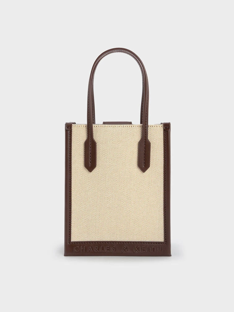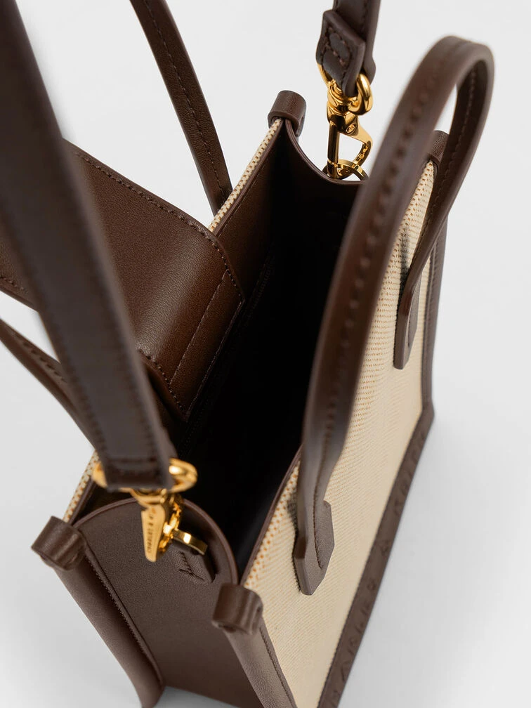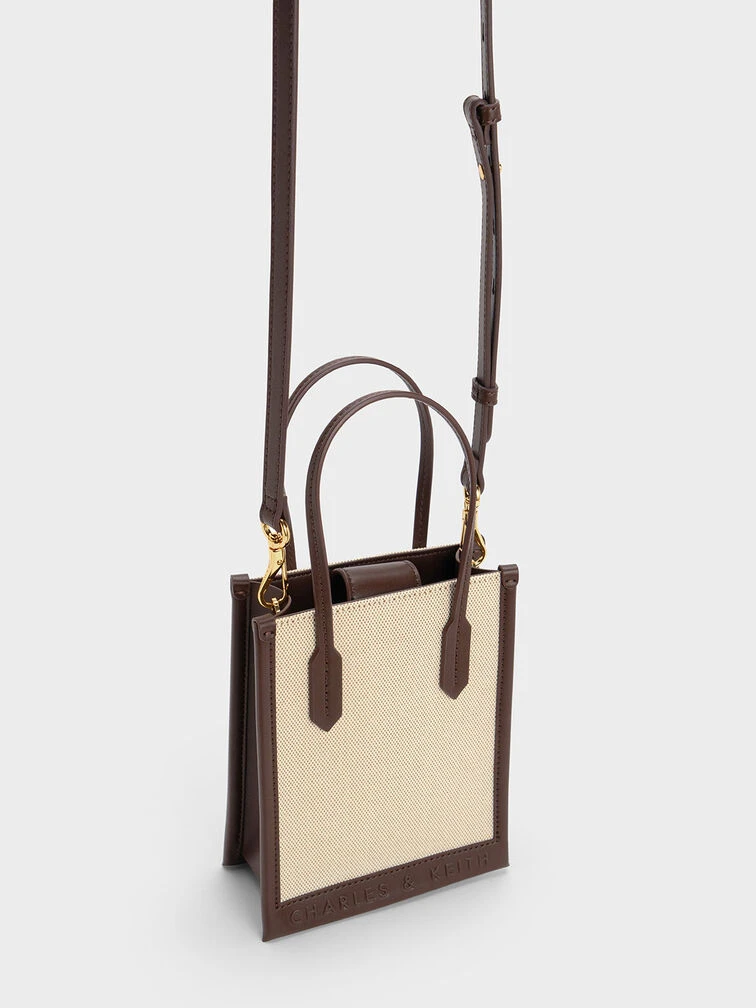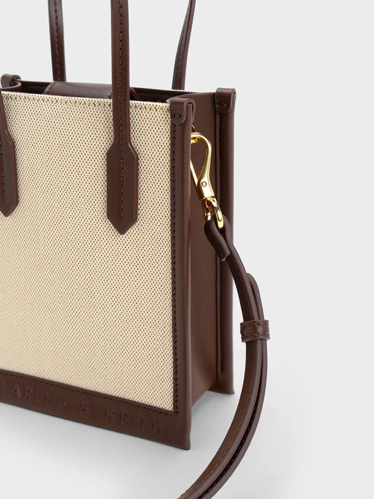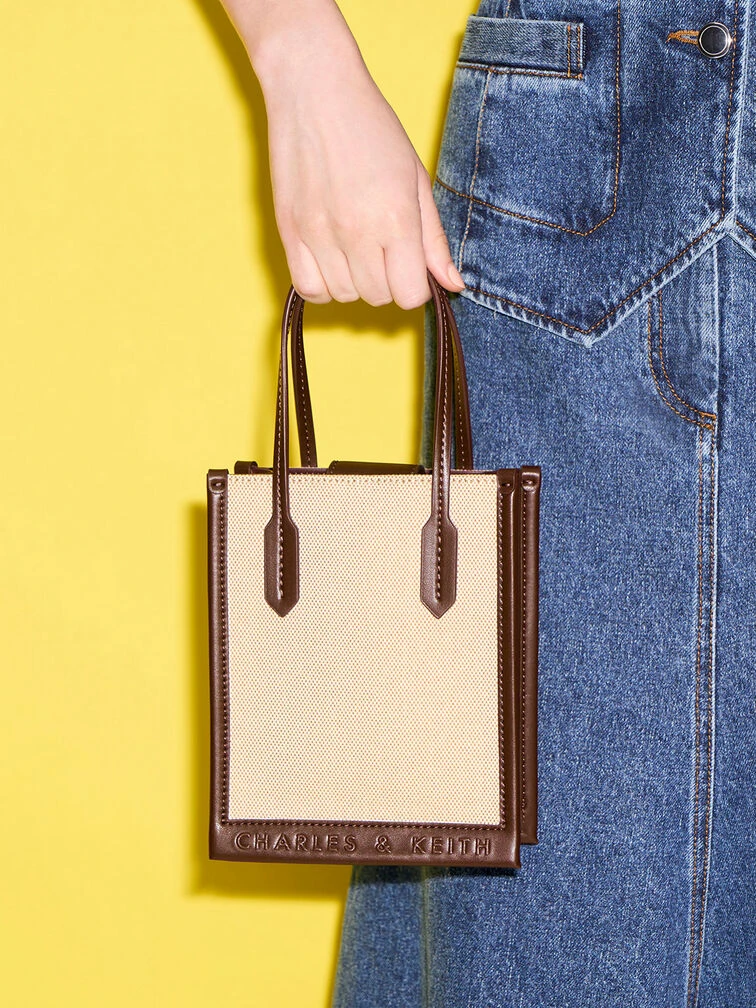 Cool and utterly chic, this geometric canvas tote bag is the perfect piece to complete any casual ensemble. Featuring a classic rectangular silhouette, a versatile cream-and-brown colourway, and lightweight canvas construction, this bag will slot seamlessly into your wardrobe rotation. Carry yours by the elongated double handles, or simply clip on the detachable strap and turn it into a crossbody bag for hands-free convenience.