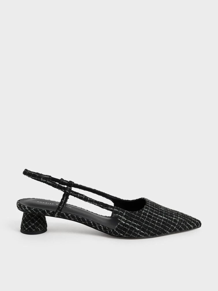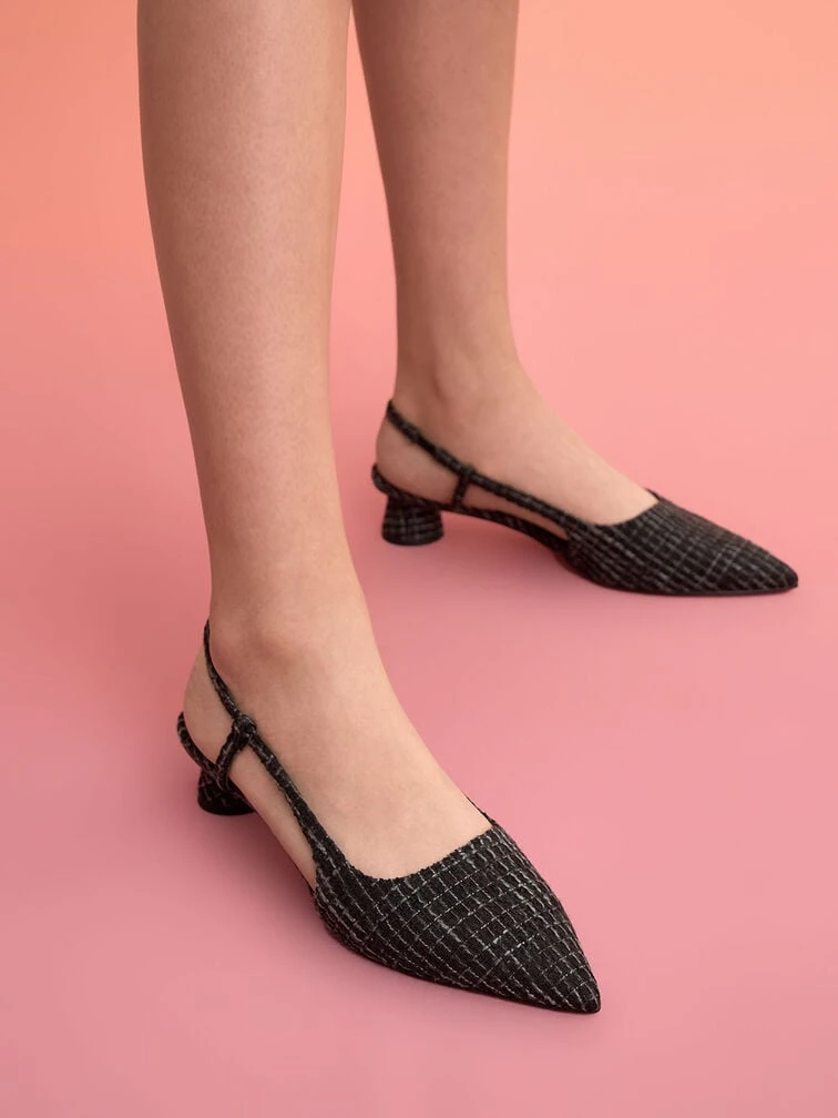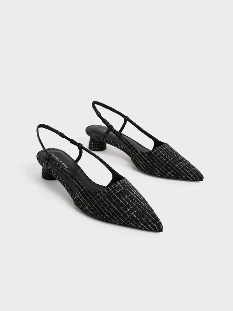 For those with a penchant for prints, this tweed iteration of our cylindrical heel pumps are not to be missed. Featuring a polished pointed-toe silhouette and strappy slingback straps, instantly elevate any look the moment you slip these on. While the 3.5cm tall sculptural heel adds both visual intrigue as well as a modest height boost, the star of the show is definitely the gorgeous tweed design that subtly showcases your style.
