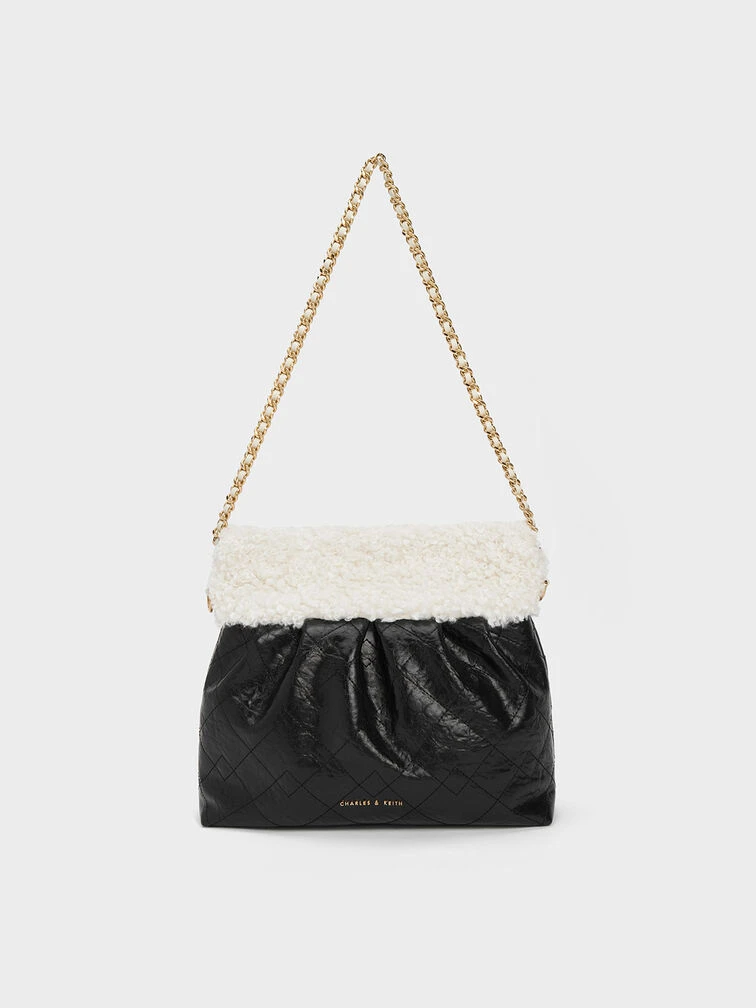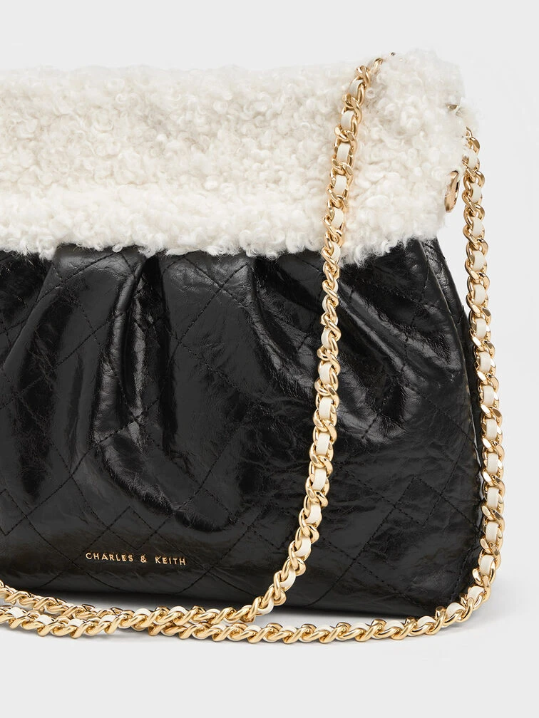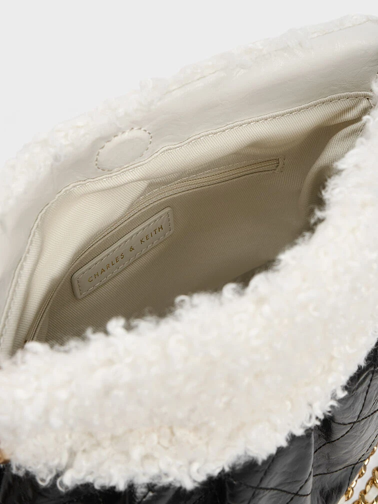 Made for cold winter days, this statement-making iteration of our Duo chain bag is set to become a star accessory in your fall-winter wardrobe. Featuring a tactile crinkle effect and an eye-catching fur trim, this striking carrier will certainly set you apart from the crowd. Yet, the neutral black-and-beige colourway is versatile enough to complement a range of outfits – you will find yourself reaching for it a lot more than you would expect.