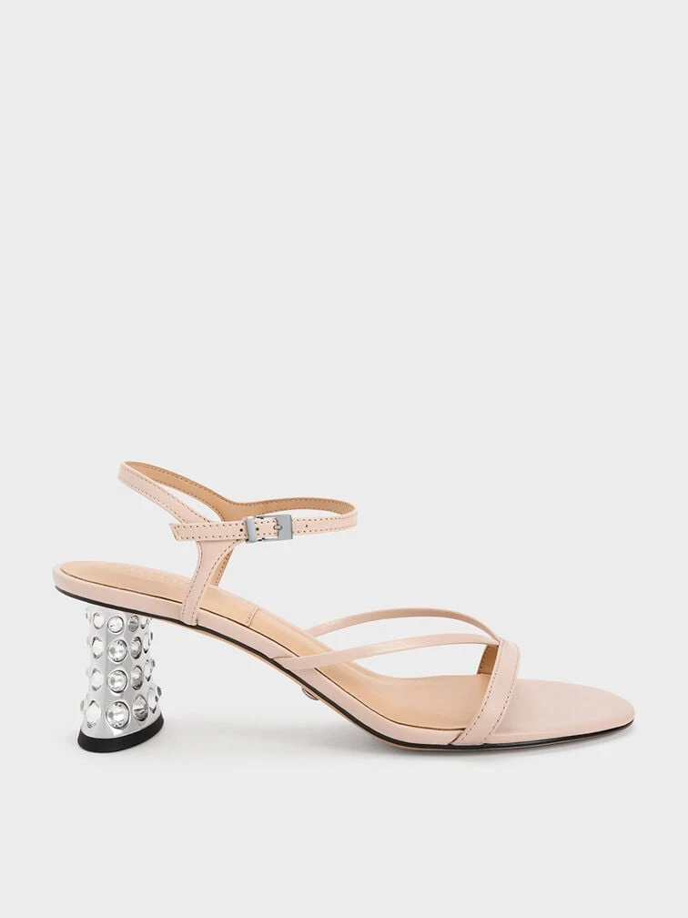 Our latest take on strappy sandals is designed to impress. They come fitted with slim half-crossover straps and are set on striking metallic heels that are studded with gems. Simply adjust the slim straps to find your perfect fit. Style this versatile nude pair with a neutral outfit for a standout monochrome moment.