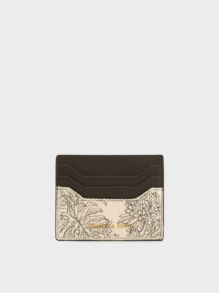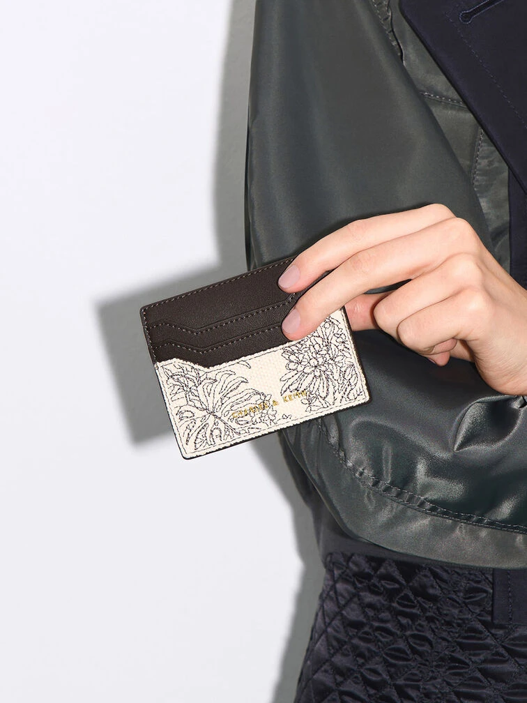 Adorned with botanical motifs and our brand logo in gilded gold-tone, this dark moss card holder has no shortage of striking design elements. It is crafted from lightweight canvas and features card slots made from smooth faux leather. This gem will fit comfortably in the palm of your hands and is the perfect accessory to carry when you are travelling light.