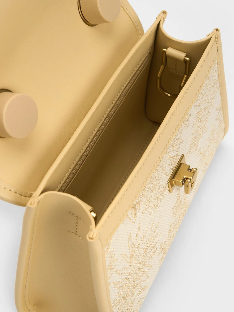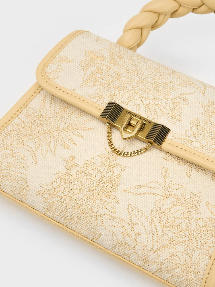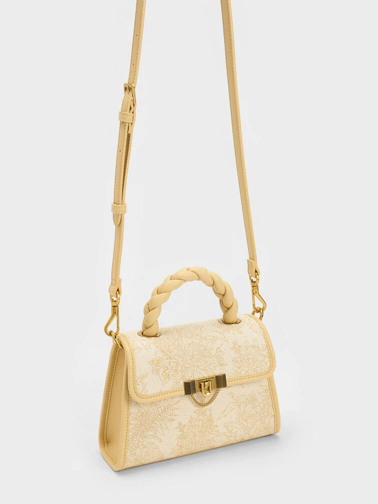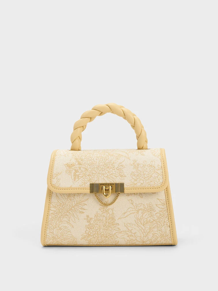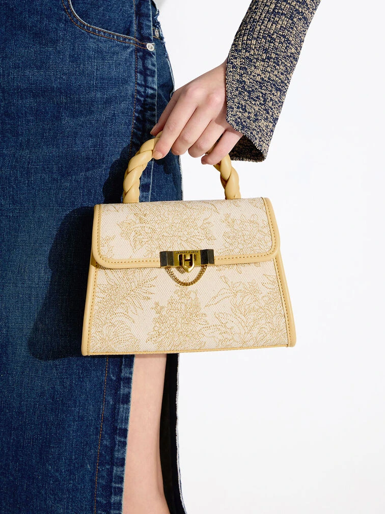 This trapeze bag will set you apart from the crowd. A visually captivating botanical print, gilded gold-tone push-lock and a braided handle work to create a cohesive aesthetic. Carry this gem by the top handle or the adjustable bag strap and be sure to team them with outfits in matching neutral palettes.
