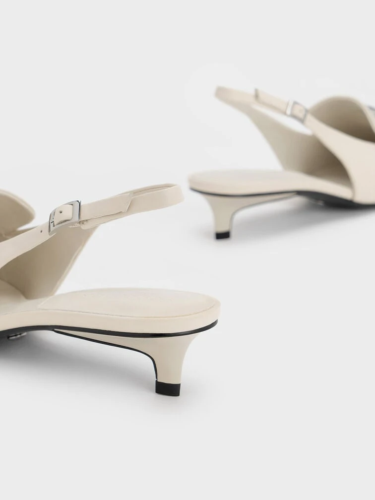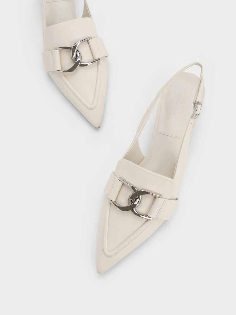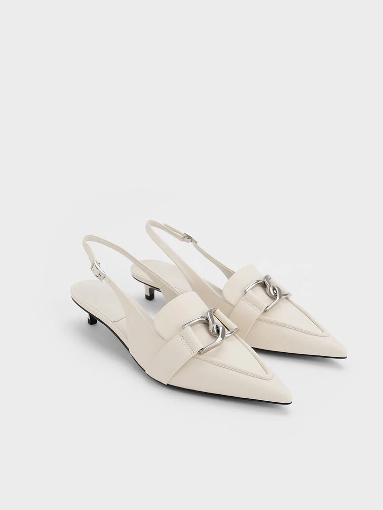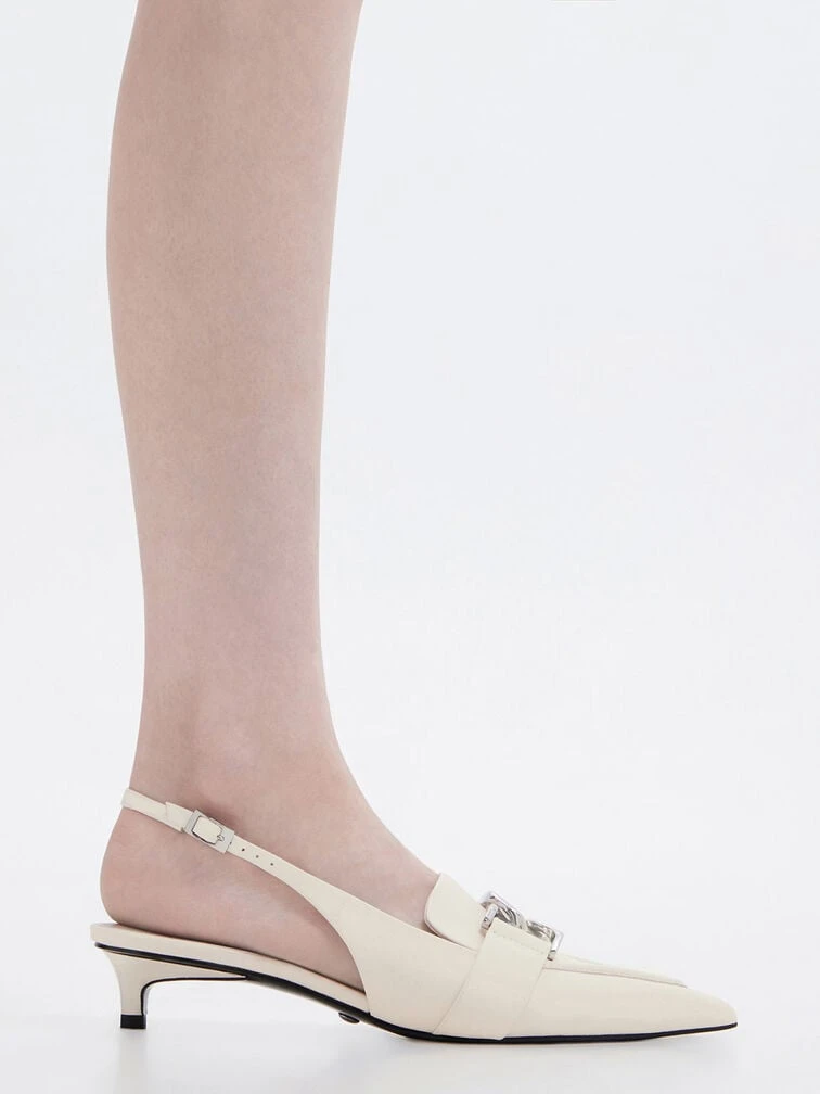Brighten up the short, dark days of fall and winter with a touch of sophistication — these chalk-white Gabine leather slingback pumps are a refreshing departure from the usual dark tones. Designed with comfort in mind, they are thoughtfully crafted with elegant kitten heels and a chic slingback design. The interlocking silver-toned Gabine buckles steal the spotlight as the standout feature of these pumps. Adding a touch of understated elegance, they elevate the overall design, making it both unique and classically charming.