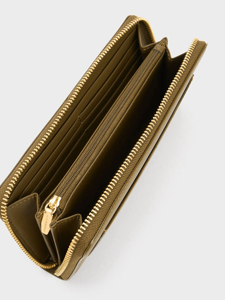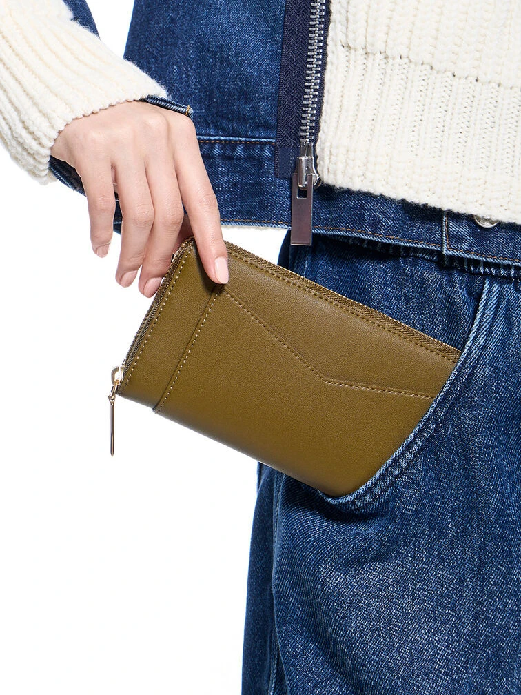 In gorgeous khaki, this earth-toned iteration of the Gaia wallet is the style essential you will reach for on repeat. Featuring a classic zip-around closure that opens up to a spacious interior, this wallet offers ample space for all your daily necessities, while its long form adds a touch of modernity to your everyday routine. Keep your essentials within easy reach, thanks to the handy cut-out front pocket.