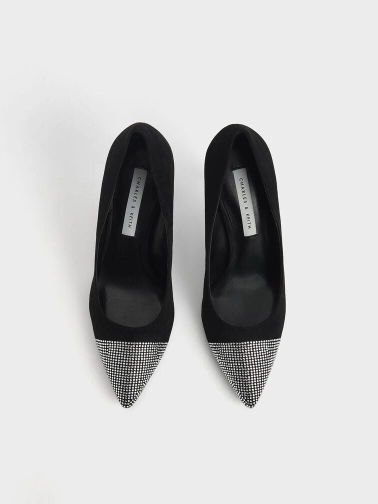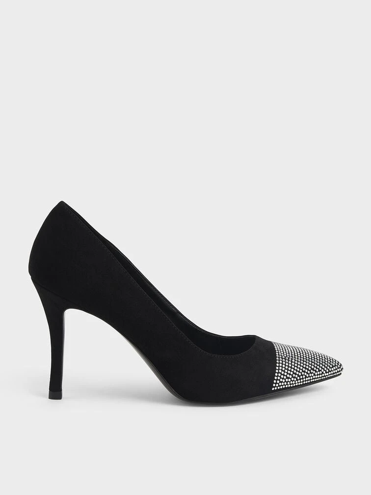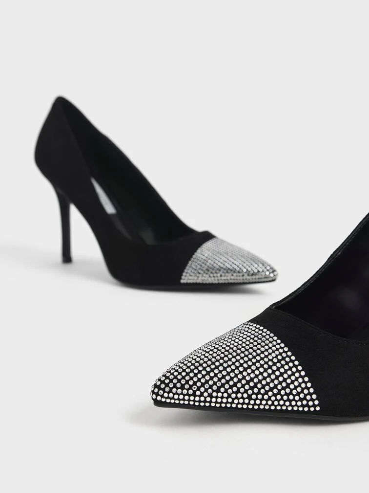 A pair of stilettos made for your inner fashion juggernaut, and just in time for the festive season. Reach for these luxurious faux suede pumps on days when you want to stand out from the crowd. Set on vertiginous 9 cm stilettos, crafted in a classic black, and sprinkled with gem embellishments, this pair will add a hint of sparkle to your ensembles. Try them with a cocktail dress and a glitter clutch for your next party.