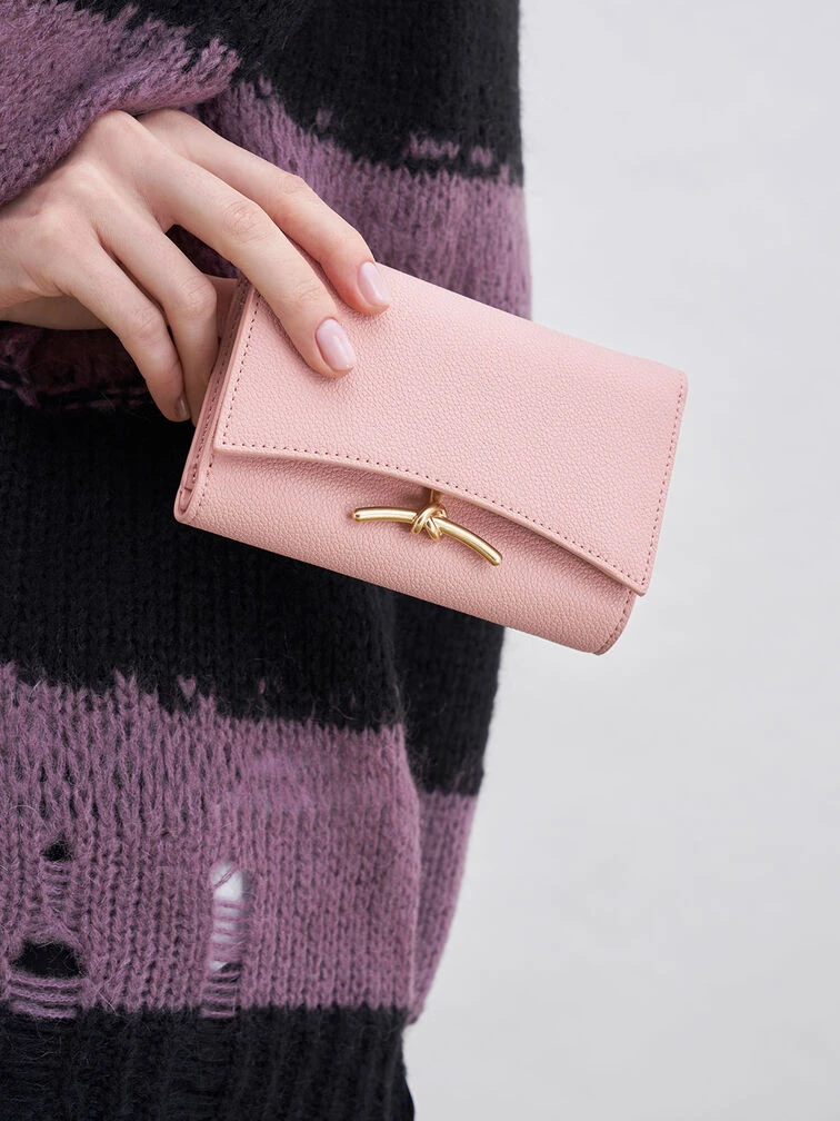 Feminine and charming, this pretty pastel pink iteration of our Huxley wallet is set to become your new favourite accessory. From the sleek curved front flap and knotted gold-toned metallic accent to the secure push-lock closure and multiple compartments, this wallet offers style in spades while staying functional to boot. Slip it into your everyday bag or carry it on its own for quick errand runs.