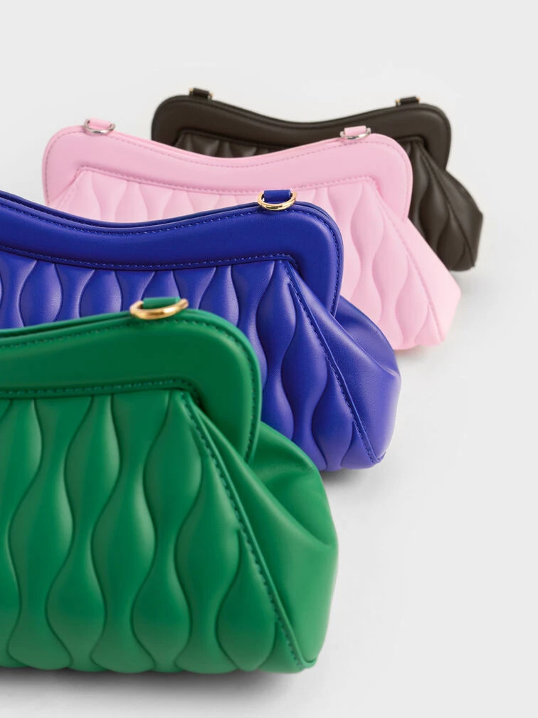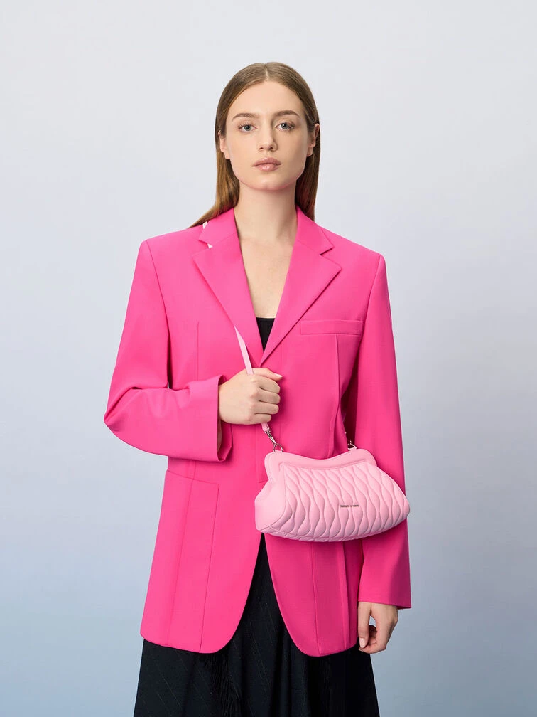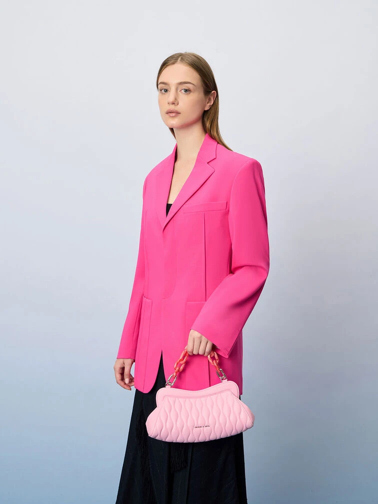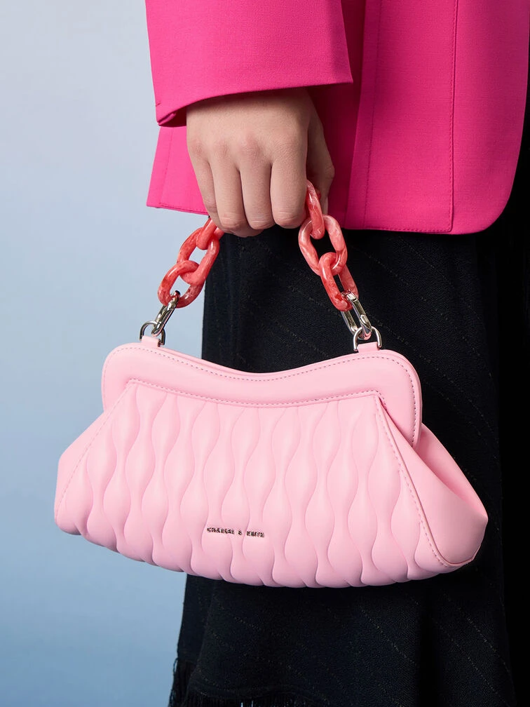 This light pink Iva clutch lets you dip your toes into the Barbiecore trend without overcommitting. It is just the right size to hold everything you need in a day and features a magnetic closure that offers quick and easy access to your belongings. Whether you hold this pretty piece in the palm of your hands or hang it from the crook of your arms with the matching acrylic chain handle, it promises an effortlessly chic look.