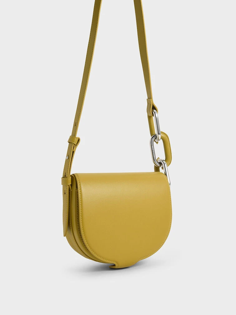 Add a splash of colour to your looks with our Kora saddle crossbody bag. Designed to hold your necessities while still looking stylish, this medium-sized beauty comes in a refreshing mustard shade that makes it the perfect complement to your new neutral outfits. The focal point of this design would undoubtedly be the chunky chain link in sleek silver. With a magnetic closure for easy access, we think it will play well with a bodysuit and denim wide-legged pants.