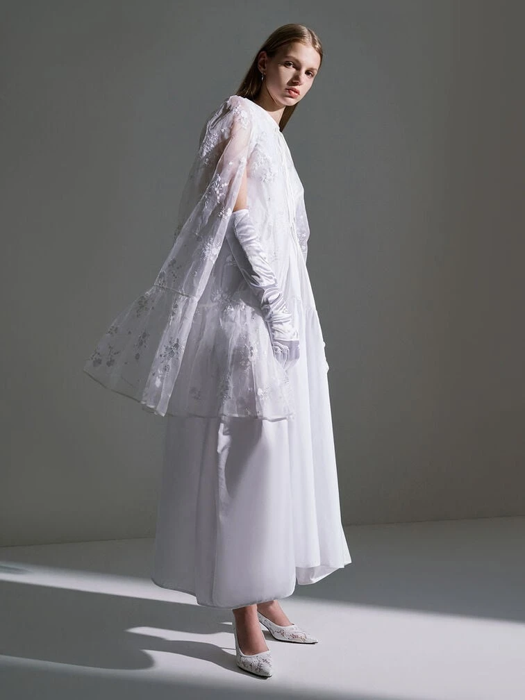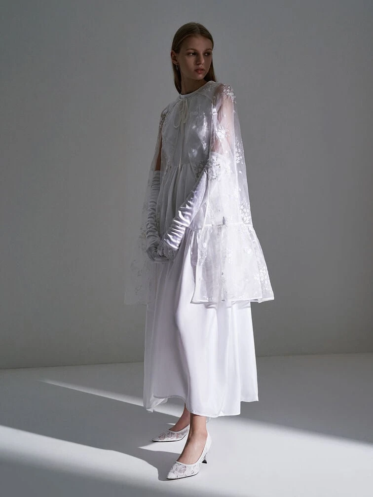 A blend of vintage charm and modern energy, these alluring pumps ooze charisma, making them the perfect outfit companion to your wedding parties. There is something so utterly polished about a one-shade palette, especially when that color is pristine white. Combine that with delicate lace and mesh and you have got yourself a winning shoe style. Bonus points for the pointed toe, as well as the sleek metallic sculptural heel which helps to elongate your frame. Go full vintage by pairing these beauties with a black midi dress with white lace details and a clutch bag.