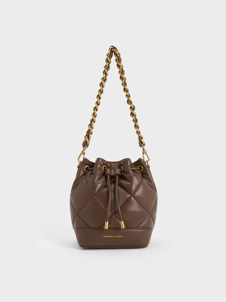 Embrace the versatile nature of neutral tones with this dark brown bucket bag. Its rich, earthy aesthetic will add a touch of opulence to your fall-winter wardrobe. The classic drawstring closure enables quick and easy access to your belongings, revealing a spacious interior that can accommodate all your daily essentials and more. What sets this bucket bag apart is its quilted finish and gold-toned chain handle, exuding timeless glamour and sophistication.