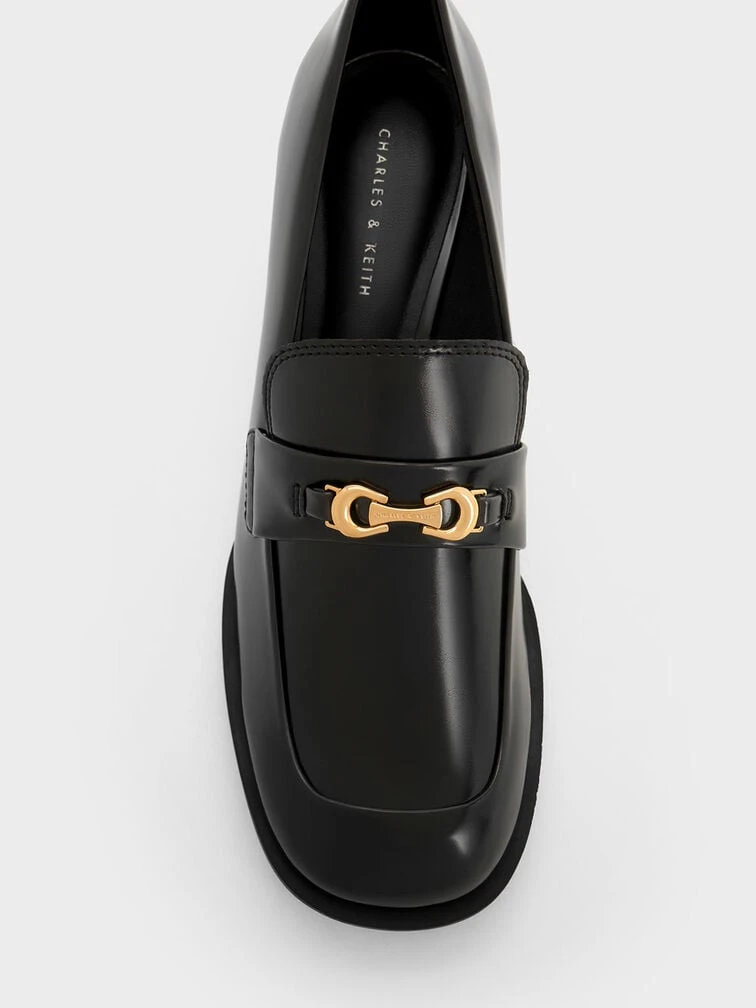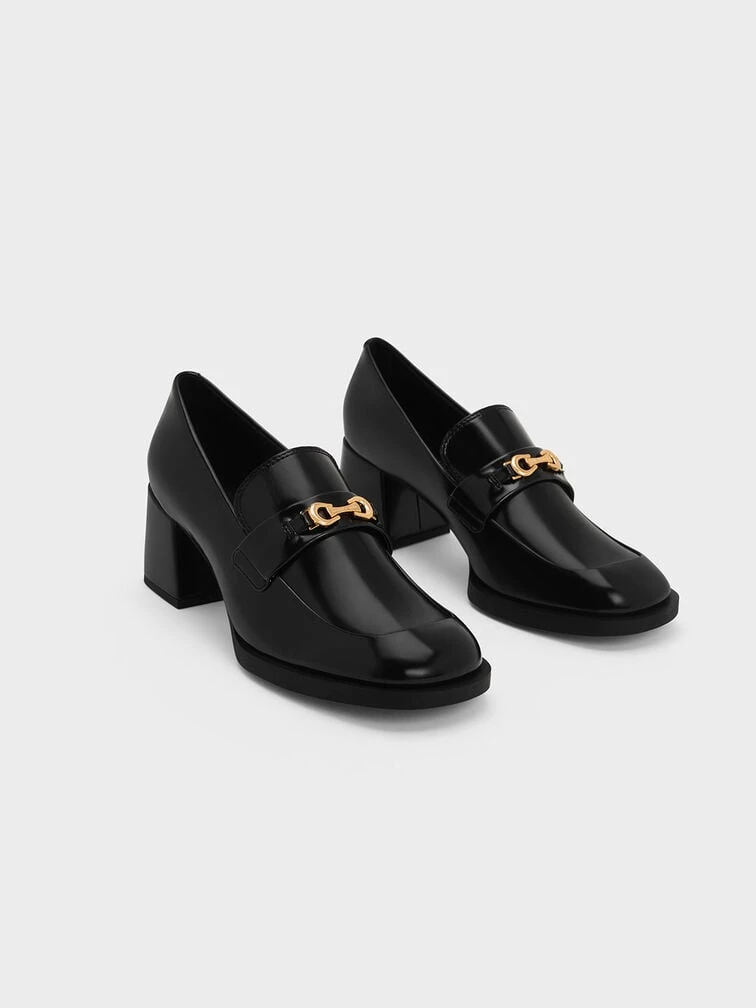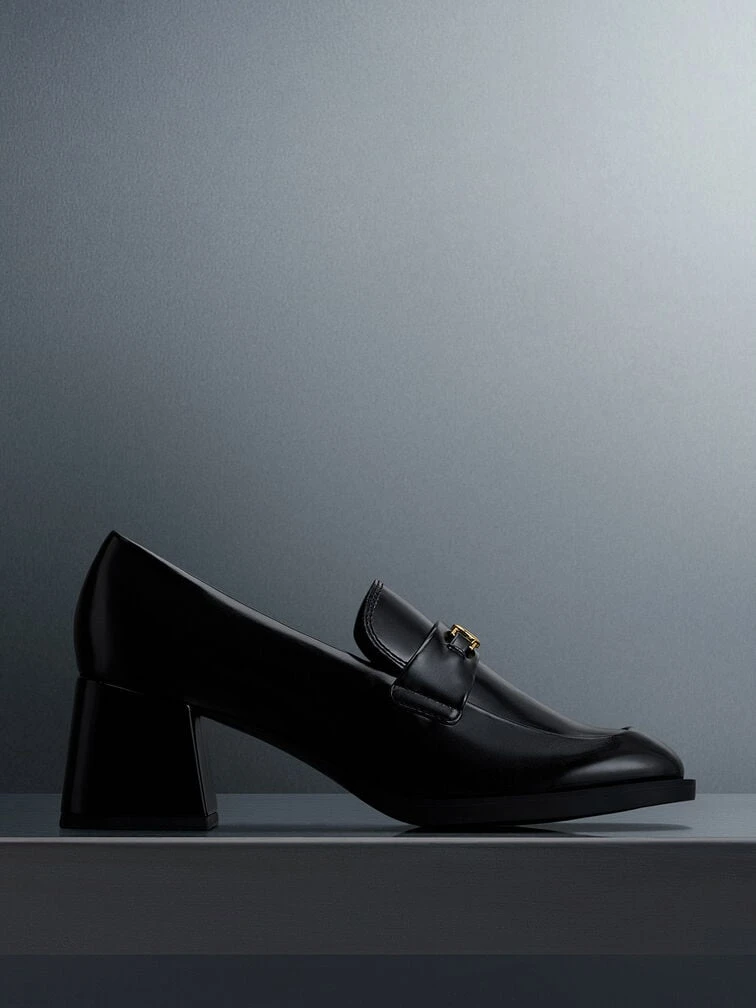 Let your favourite stiletto heels take a backseat in favour of these loafer pumps. From the shiny boxed finish to the understated, clean design and sturdy block heels, these pumps channel polished sophistication while offering you all-day walkability and comfort – they will make a great addition to your workwear wardrobe. The brushed-gold metallic accents will add a hint of shine and vintage glamour to any look.