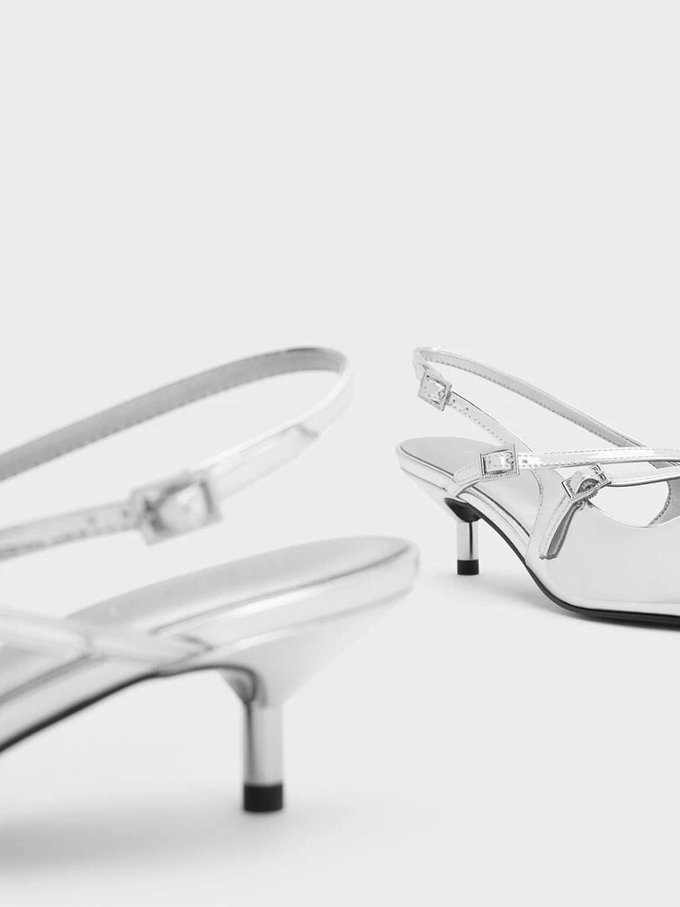 These metallic slingback pumps will definitely make an impression. The mirrored silver-toned finish is not only sleek and sophisticated, but will also imbues your look with a futuristic touch. Putting a spin on the classic slingback silhouette, double buckled straps enhance the leg-lengthening effect while adding visual interest. Set on sensible kitten heels in a matching metallic finish, wear these to instantly elevate any ensemble, be it for work or play.