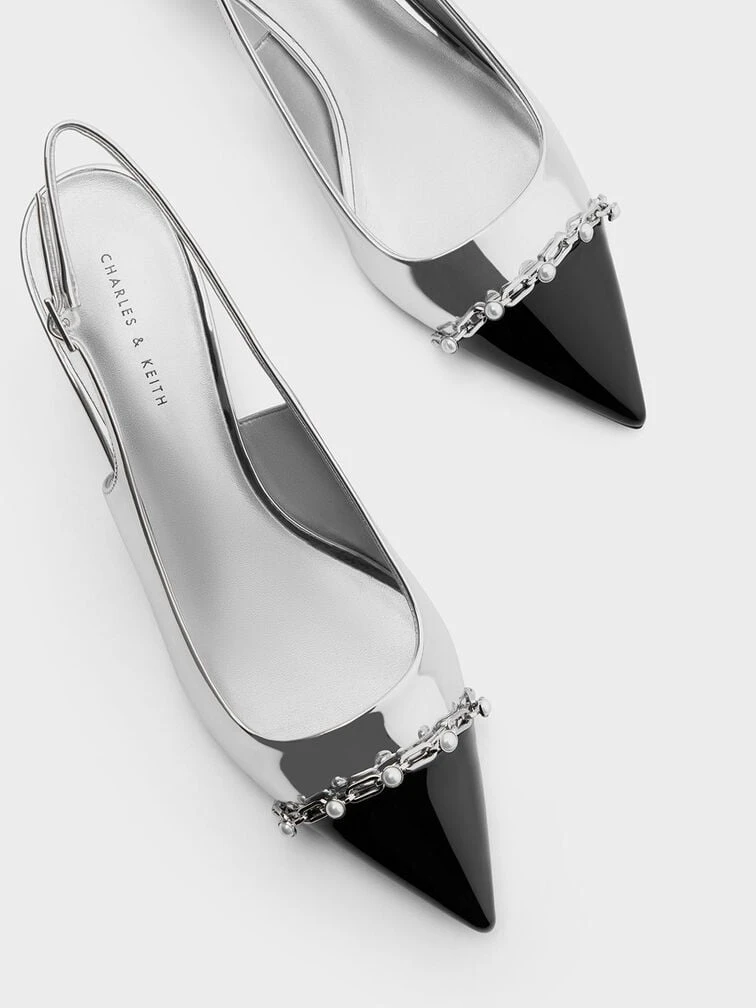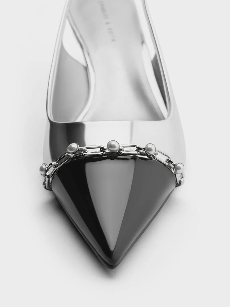 With a stunning silver finish, this metallic version of our pearl chain-link slingback pumps will command attention wherever you go. Featuring a classic pointed-toed silhouette, complemented by contrasting black faux patent toe-caps, they also come adorned with dainty chain-link and pearl embellishments for added visual interest. Bonus points for the moderate 4.5cm spool heels and adjustable slingback straps, which ensure that these pumps remain comfortable enough to stand and walk in all day.