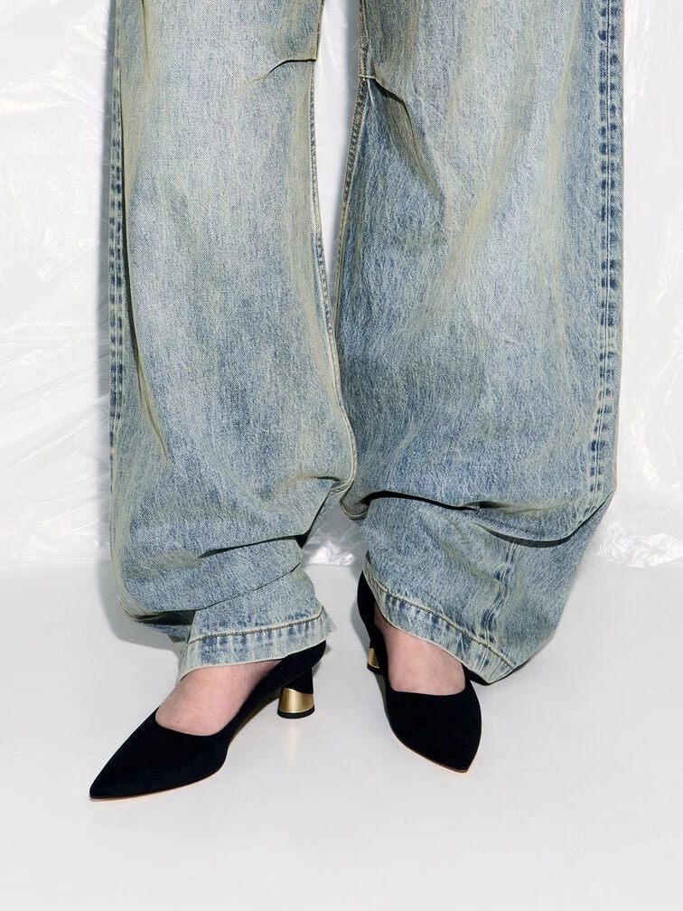 Looking classy throughout the week will be a cinch when you have these stunning pumps working for you. Fall in love with the impressive combination of the sculptural heels and textured black faux suede finish that will elevate your style with ease. Bonus points for the metallic accent at the heel that adds a whimsical touch to your looks. For an effortlessly chic ensemble, we recommend styling them with a smocked waist top, baggy jeans and a woven tote bag.