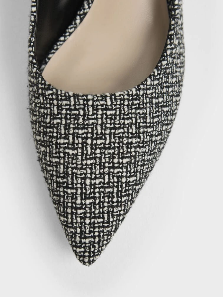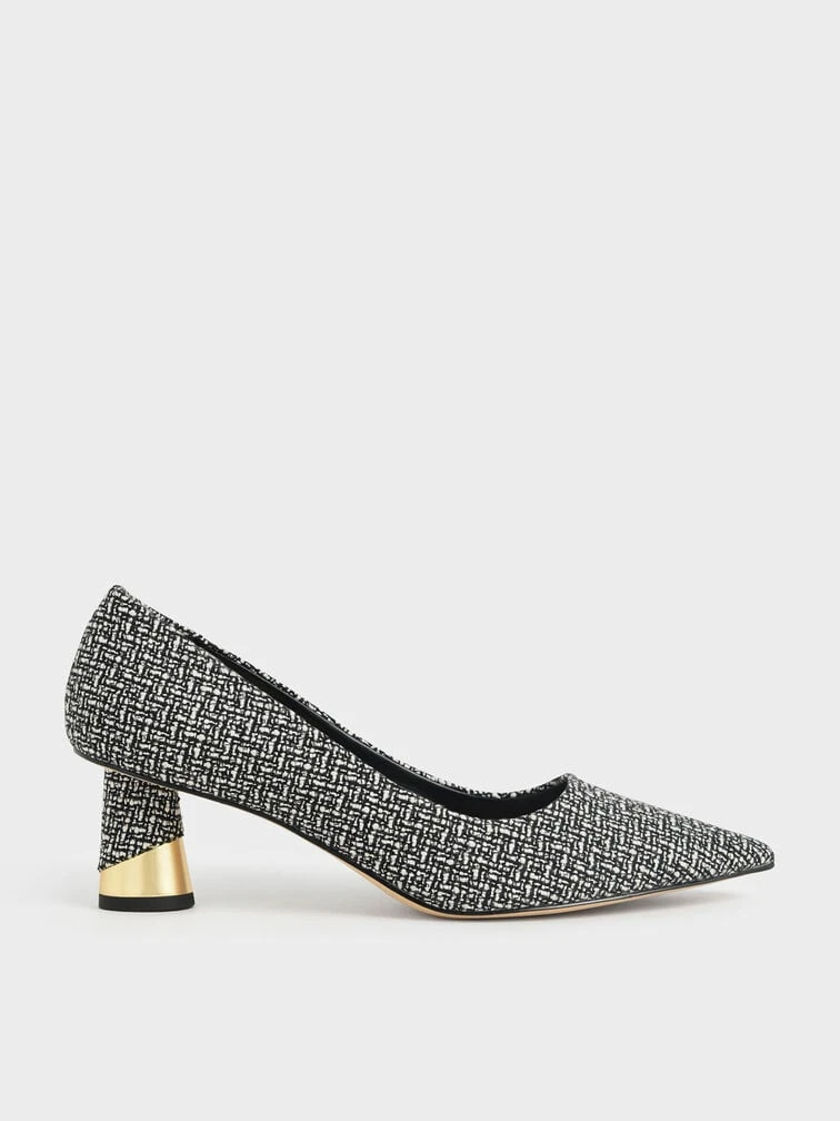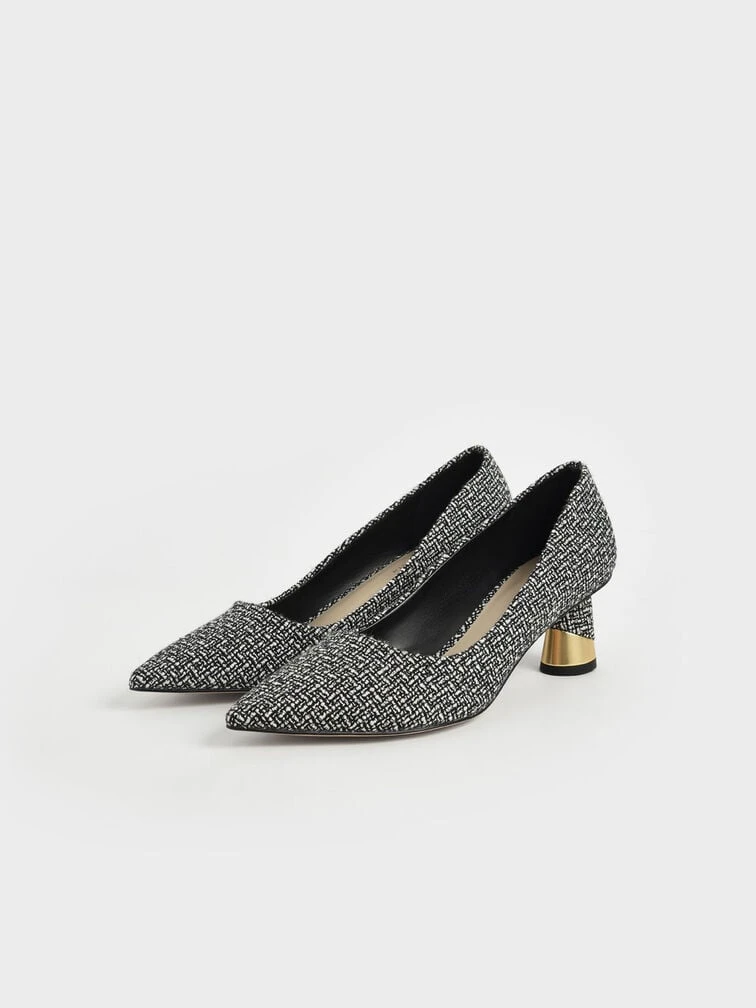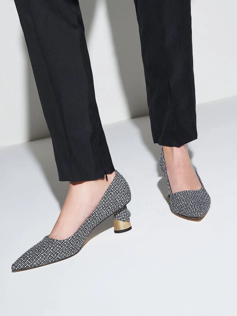 Give your feet a modern makeover in this black-and-white textured tweed pumps. Featuring a covered pointed toe and metallic sculptural heel, these pumps are the epitome of classy sophistication. Bonus points for the ease of wear, just slip them on and off you go. Style tip: dress them up with an animal-print puff-sleeved top and paperback pants for a stunning workwear ensemble.