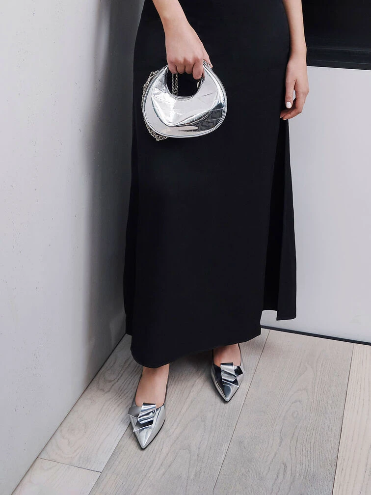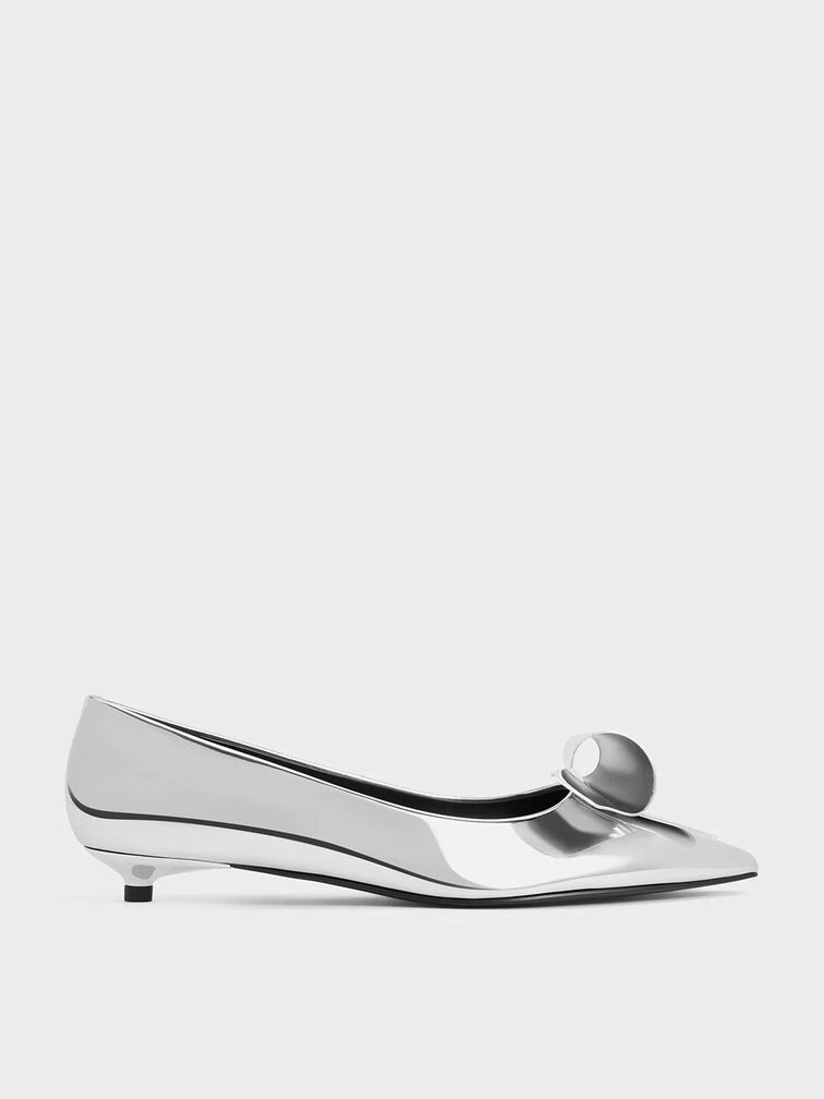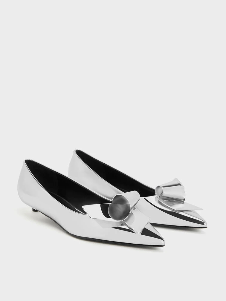 Lean into the metallic trend with these flats. Featuring a high-shine mirrrored finish that will catch the light at every angle, the pointed-toed silhouette is refreshed for a contemporary feel. To add visual interest, sculptural knots top the vamps as statement-making details on the wearable style. Let this pair shine against an all-neutrals outfit, or match them with other silver pieces for a dazzling effect.