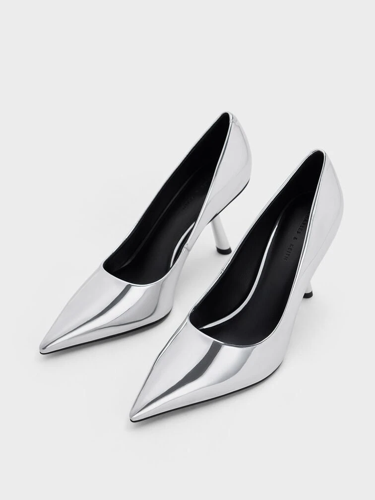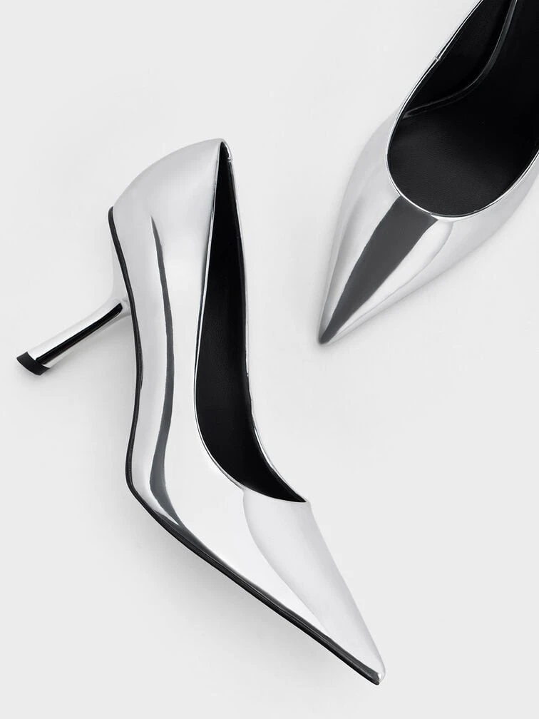 Meet your perfect style companion for all your year-end parties and gatherings. These pumps feature an outstanding metallic hue and silver reflective sheen that are sure to captivate the crowd wherever you go. They also feature an extra sharp and elongated pointed-toe silhouette, creating the illusion of longer legs. Bonus points for the uniquely designed slanted heels that not only add height to your stature but also a touch of visual intrigue.
