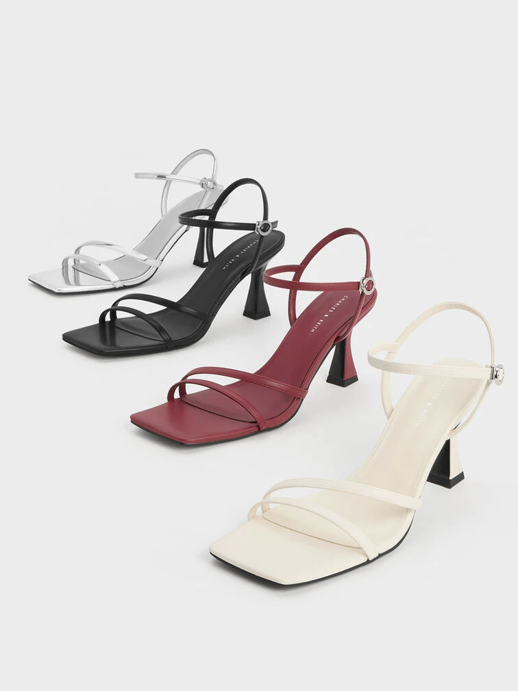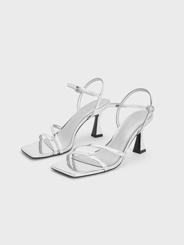 With its high-shine finish and sophisticated design, the silver iteration of the strappy trapeze heel sandals are a striking yet wearable statement. Delicate straps across the vamps accentuate the square-toed design for a flattering effect on the feet. Complete with adjustable ankle straps and 7.5cm trapeze heels, these sandals exude polished elegance. Let these glamorous sandals take you from work to your after-dark engagements – they will definitely catch the light and command attention.