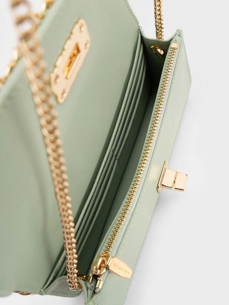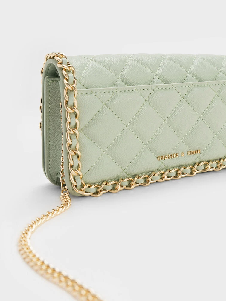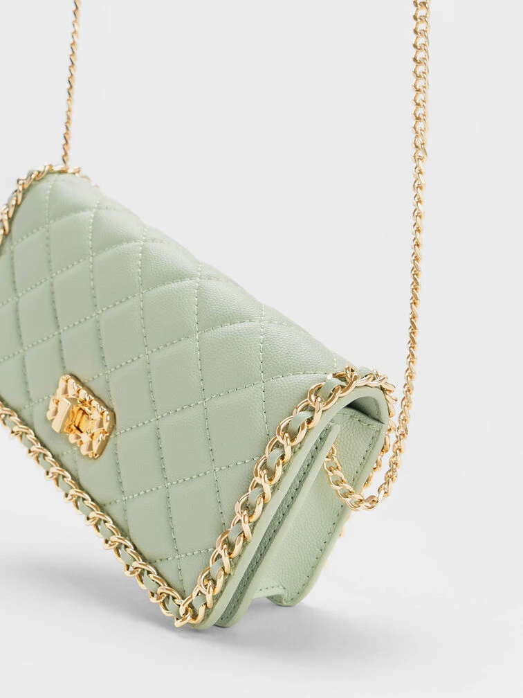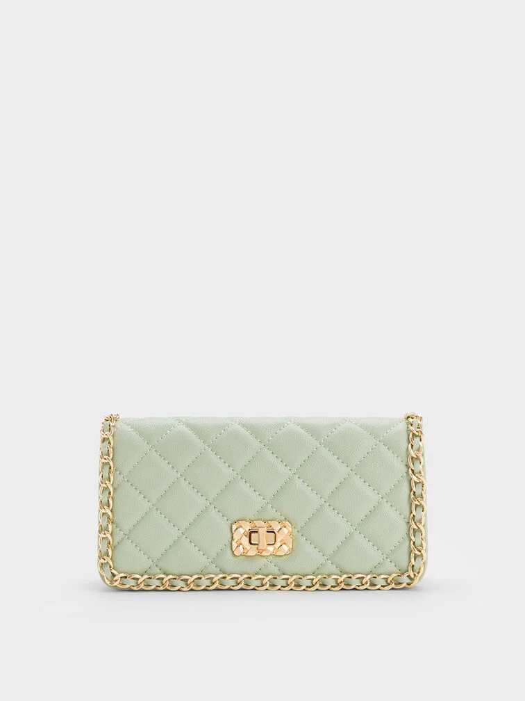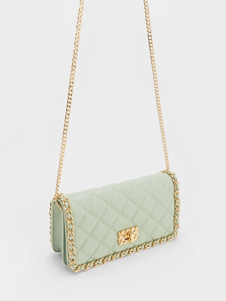 Show off your impeccable sense of style with the Micaela long wallet. With a cool mint green finish, this accessory features a braided chain trim, gem-embellished turn-lock closure, as well as a striking quilted outer that also serves to protect the belongings that you store inside. The perfect size for your phone as well as other mini essentials, this pouch looks great carried on its own as a clutch � it will look just as cute when you attach the chain strap to turn it into a crossbody bag.