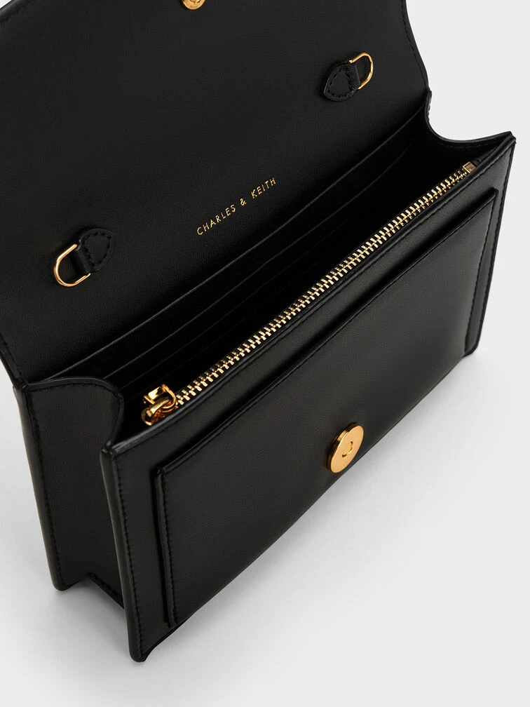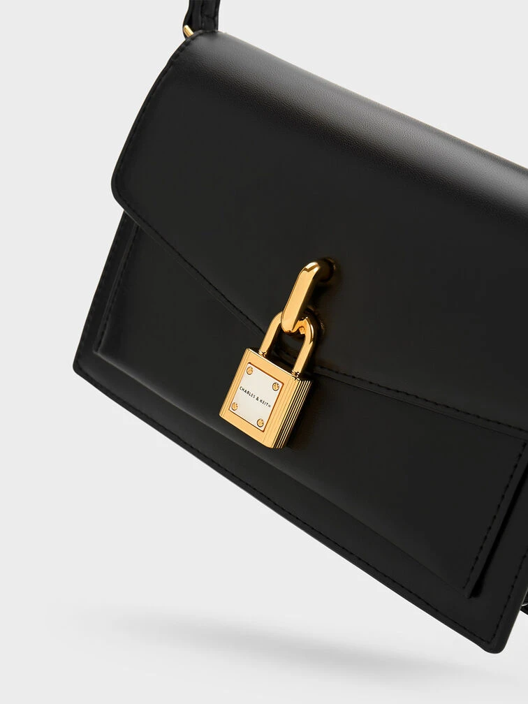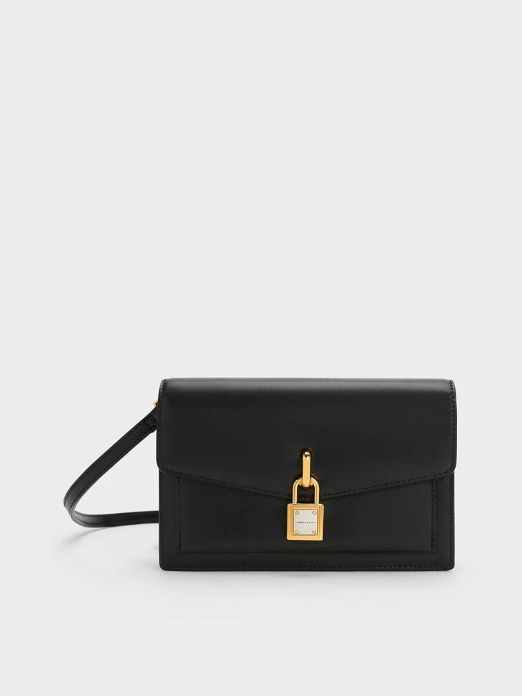 In classic black to match with everything and anything, this padlock envelope bag is definitely a closet essential. From the sleek rectangular silhouette and envelope-style top flap to the striking gold-tone padlock embellishment, this bag will add the perfect amount of polish to your every ensemble. Clip on the chain strap and wear yours as a crossbody bag, or carry it on its own as a chic clutch.