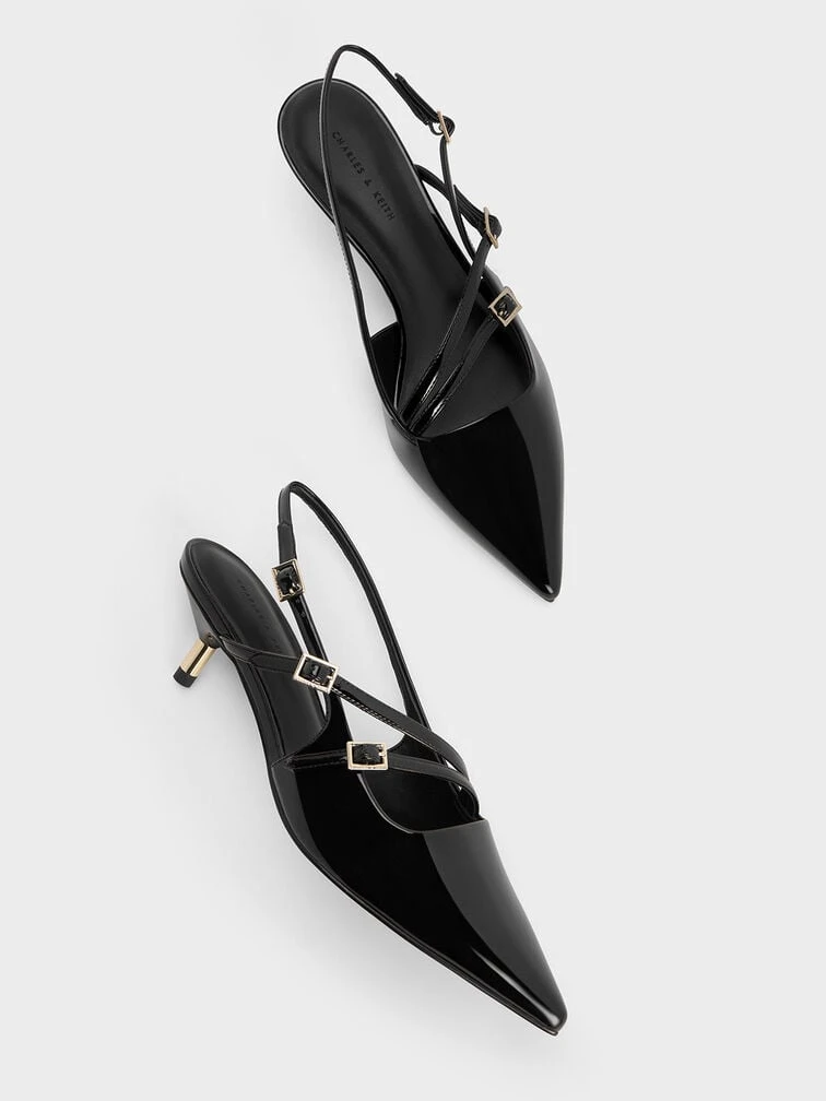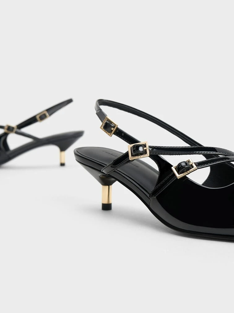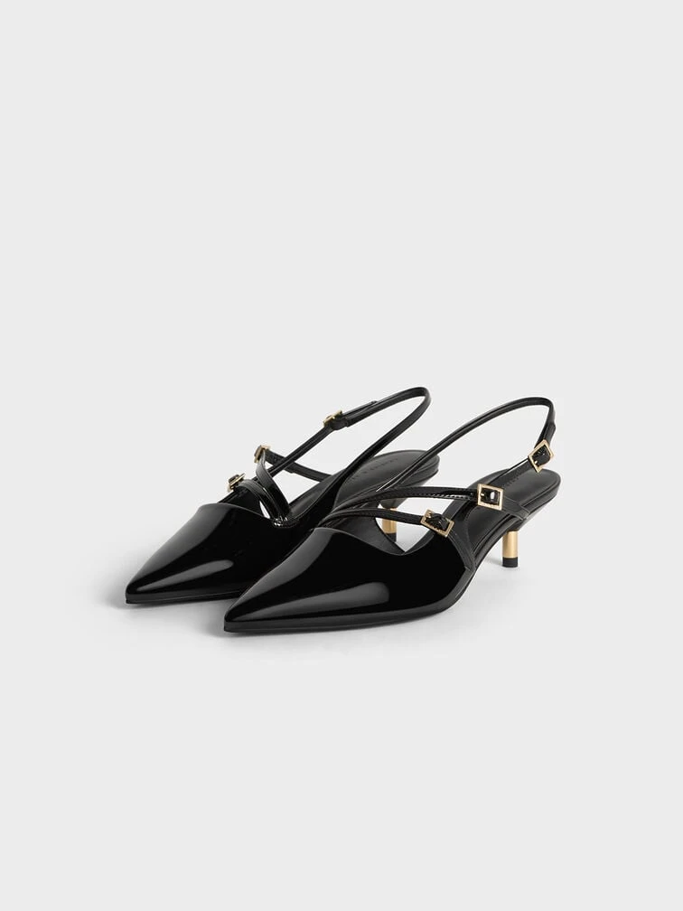 These pumps will catch the light at every angle. Featuring a high-shine black patent texture and metallic finish on the heels, this pair is understated yet impossible-to-miss at the same time. Slight tweaks to the classic slingback silhouette, like the double buckled straps across the vamps, create a contemporary aesthetic. To maximise the leg-lengthening effect, the pointed-toed style is complemented by kitten heels to give a flattering and comfortable lift to your frame.