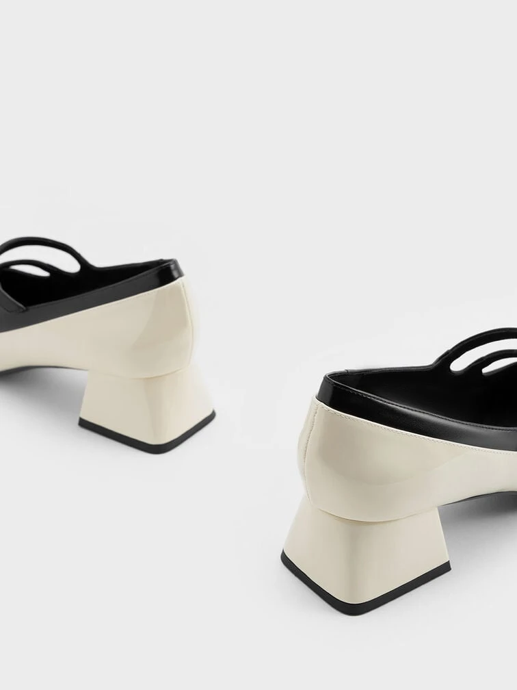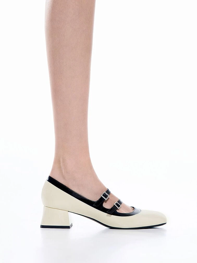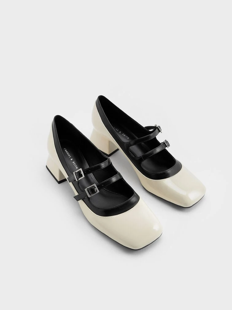 Elevate your office ensembles and smart-casual outfits in an instant with these patent two-toned Mary Janes. Juxtaposing a creamy chalk base against a black base and contrasting double buckle straps, these shoes epitomise chic sophistication. Set on 4cm chunky trapeze block heels, these shoes offer a moderate height boost that does not compromise on comfort or walkability. Bonus points for the subtly glossy patent faux leather finish, which adds polish to this versatile pair.