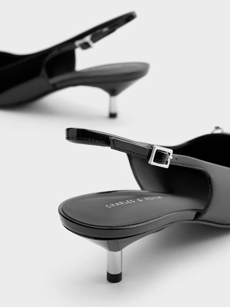 Edgy and elegant at once, these patent slingback pumps are a versatile pair to add to your closet rotation. From the chic pointed-toed silhouette and functional adjustable slingback straps to the irresistible shiny black faux patent finish, there are plenty of details to admire when it comes to this classic pair. Adorned with dainty chain-link and pearl embellishments along the contrasting white toe-caps, this visually arresting pair of pumps will elevate any outfit effortlessly.