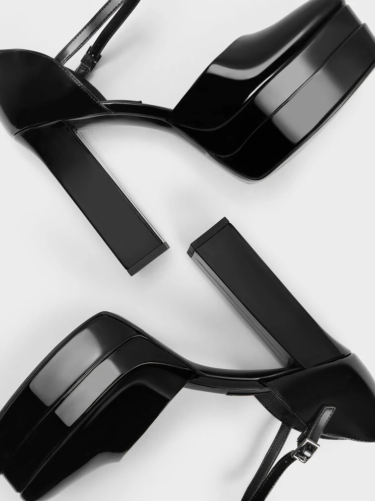 With a high-shine finish for maximum style impact, this glossy patent version of our platform pumps are made to stand out. Featuring a classic d’Orsay silhouette and tapered square toes, these versatile black beauties will slot seamlessly into your shoe collection. Set on towering 12.5cm chunky block heels and platform soles for an ultra-maximalist effect, they will have you turning heads wherever you go. For a truly eye-catching look, team these shoes with a sequinned dress and a micro bag.