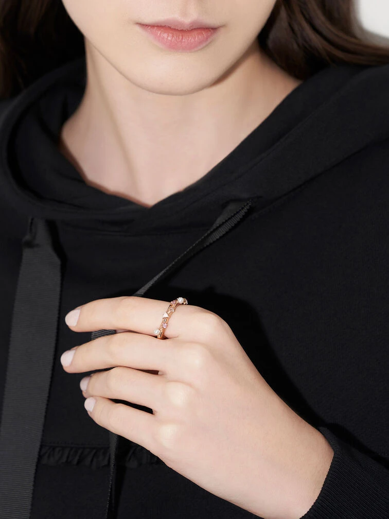 Featuring a unique angular design and a hammered finish, this exquisite piece is embellished with dainty multi-shaped light pink crystals and faux pearls that will add a touch of sparkle to your outfits. We also love the rose gold finish that makes it a refreshing alternative to your usual gold-toned jewellery, while still being versatile enough to complement both casual and dressy outfits.