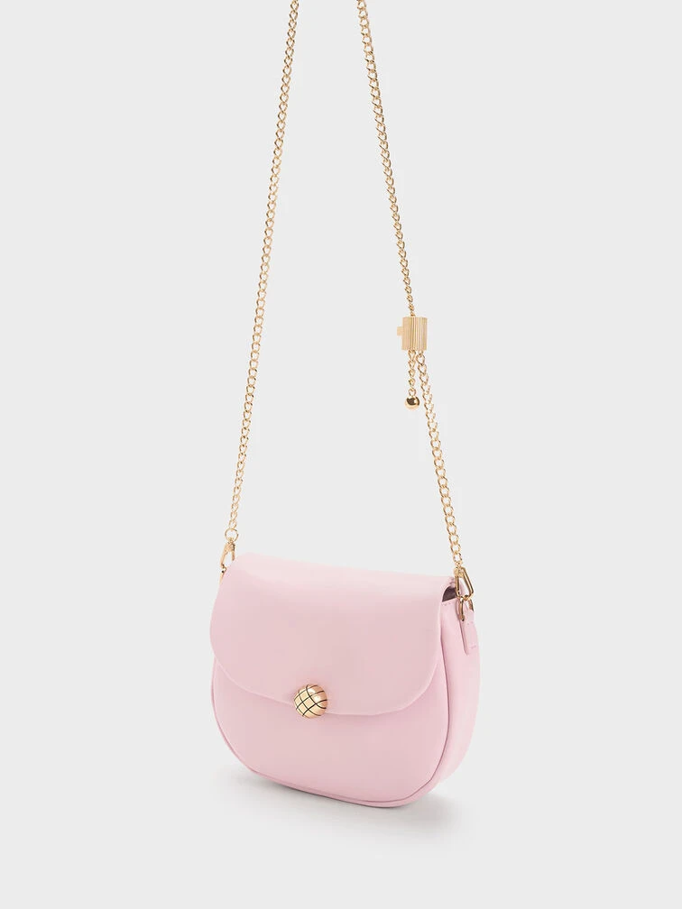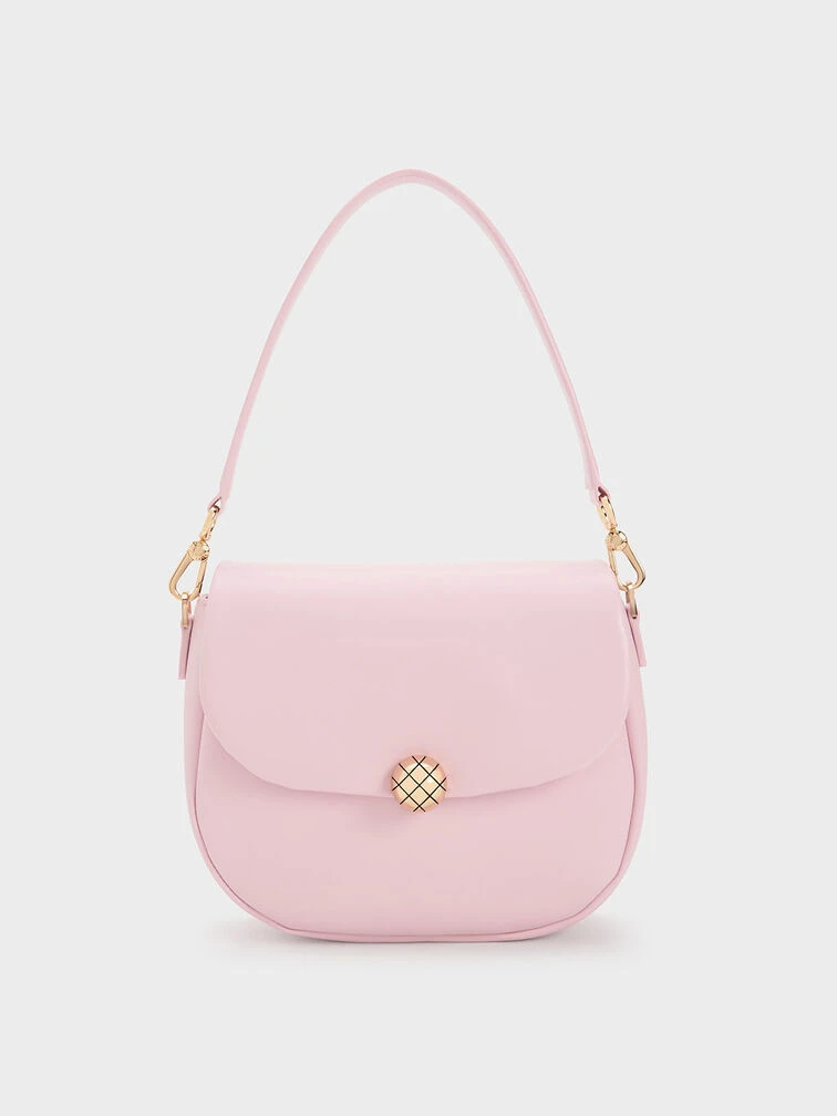 This curved crossbody bag has everything it takes to be your new go-to favourite carrier. The soft pastel finish gives this piece a sweet and feminine aesthetic, but what makes it extra special is the eye-catching woven detail on its front. Plus points for the delicate gold-toned accents that add a touch of glamorous shine that complements the bag’s classic silhouette.