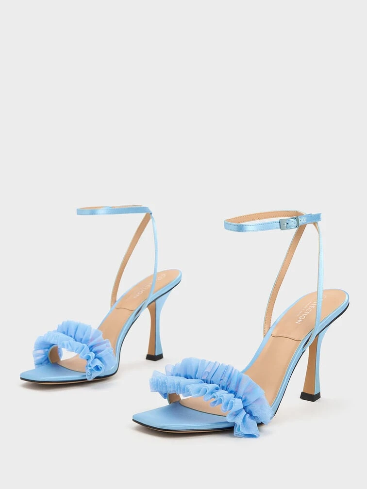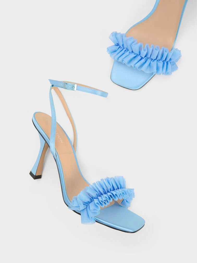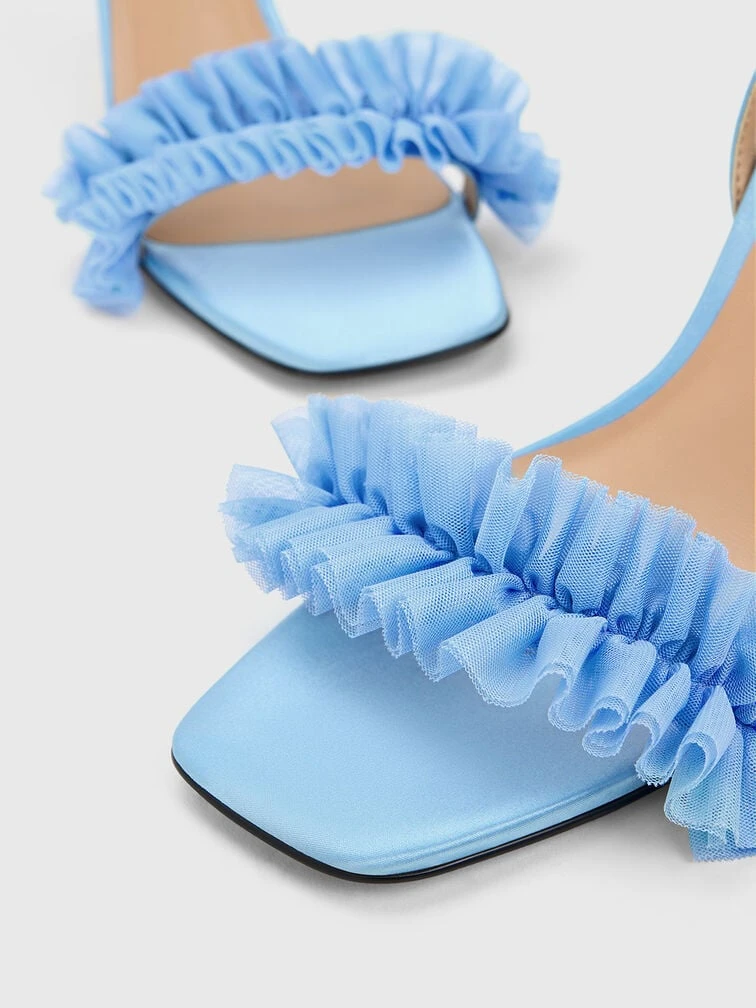 Bring some flair to your everyday looks with these heeled mules. Featuring a barely-there thong design, this minimalist pair is elevated by its ruffled mesh straps, which add textural and visual interest. Set atop 9cm flared heels, they exude a feminine charm while the eye-catching sky-blue finish will turn heads wherever you go. Wear them from day to night, with everything, from tailored separates to tapered jeans.