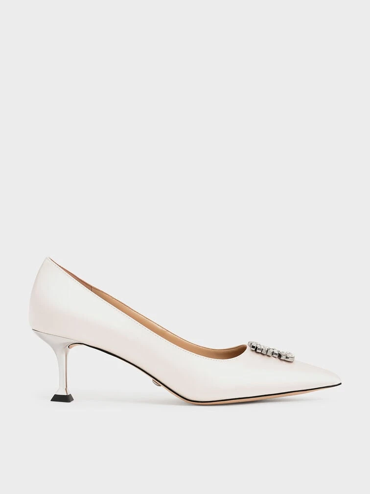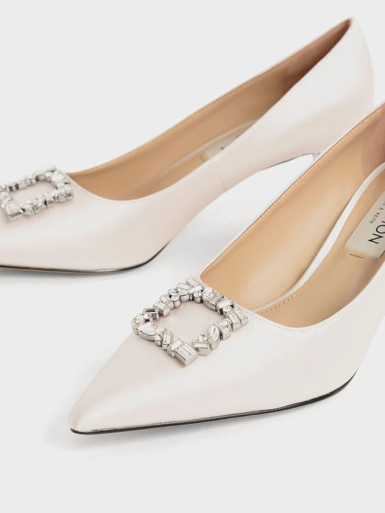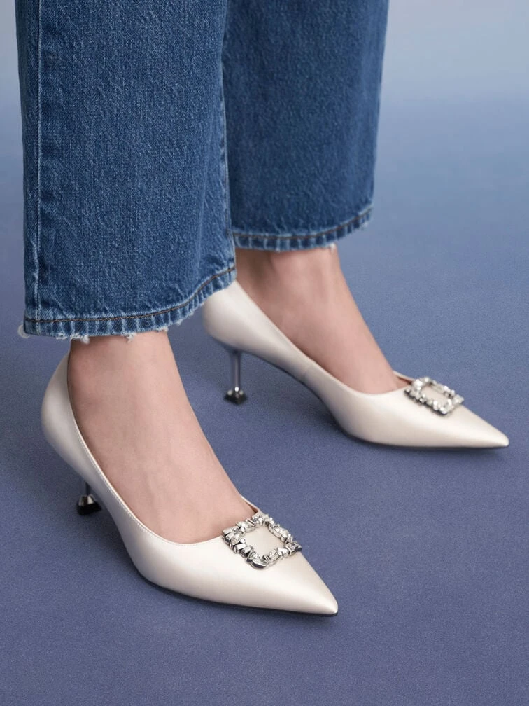 Embodying feminine elegance like no other, these pumps are the perfect match for the elaborate ensembles you will don for your bridal parties and wedding photoshoots. Swathed in refined cream-coloured satin and topped with gems in a square-shaped motif, they are the top choice for a glamourous look. Bonus points for the feet-friendly 6cm heels that offer sufficient elevation while providing walkability. Keep the compliments coming when you wear them with traditional silky gowns or modern pantsuits. Complete the ensemble with a pyramid clutch.