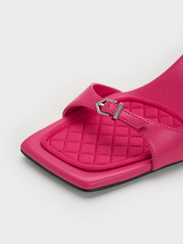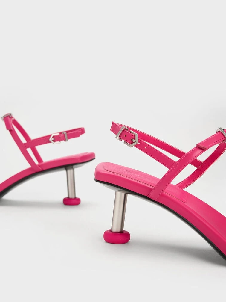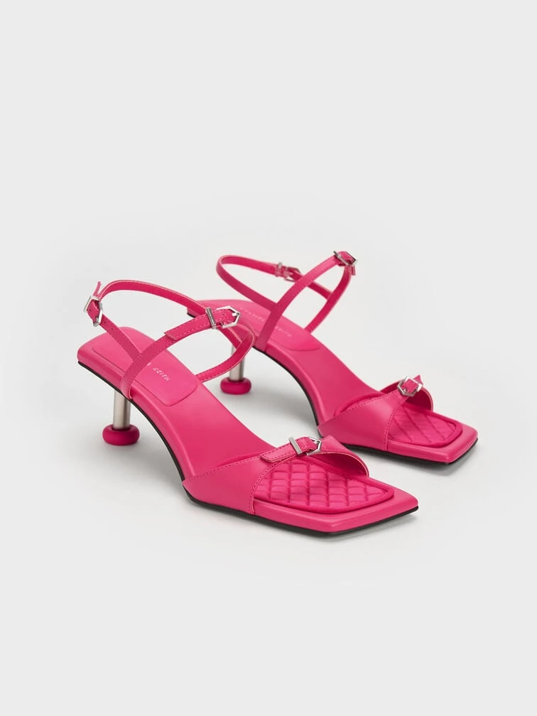 It is hard to pick the crowning glory of these strappy sandals. They feature multiple adjustable buckles that add a hint of edge to the overall look as well as metallic heels that come with circular stoppers. In a bright fuchsia finish, these asymmetric square-toe beauties will perk up your look on fun party nights and special occasion events.