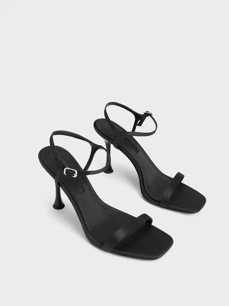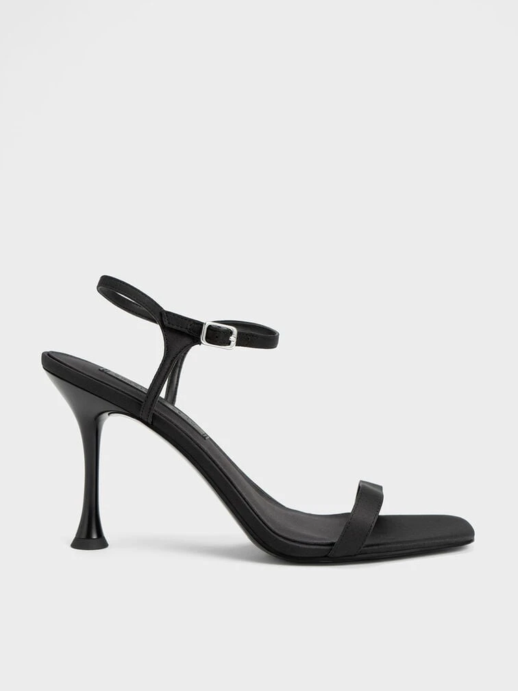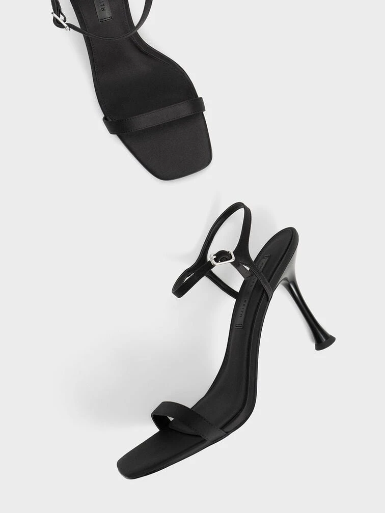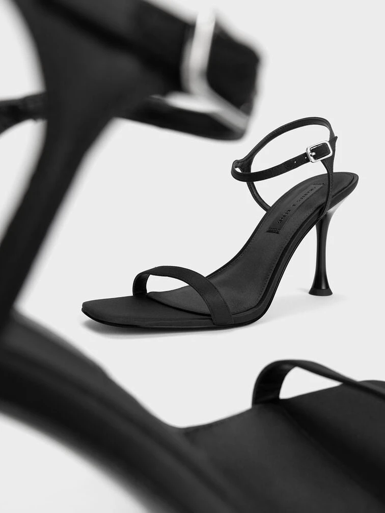 A gorgeous pair of sandals in a match-all black finish is sure to make a statement anywhere you go. The elegant 9cm spool heels exude a modern charm while offering ample height. The square toe and minimalistic design also help to elongate your frame as well. Pair these satin beauties with a bodycon dress with unique cut-out designs for an edgy evening look.