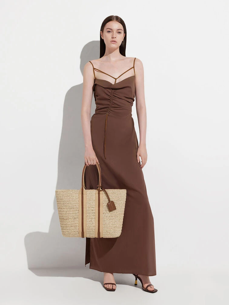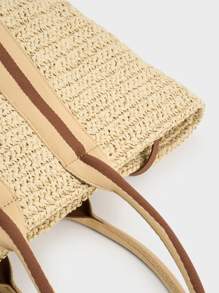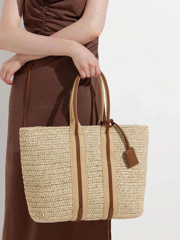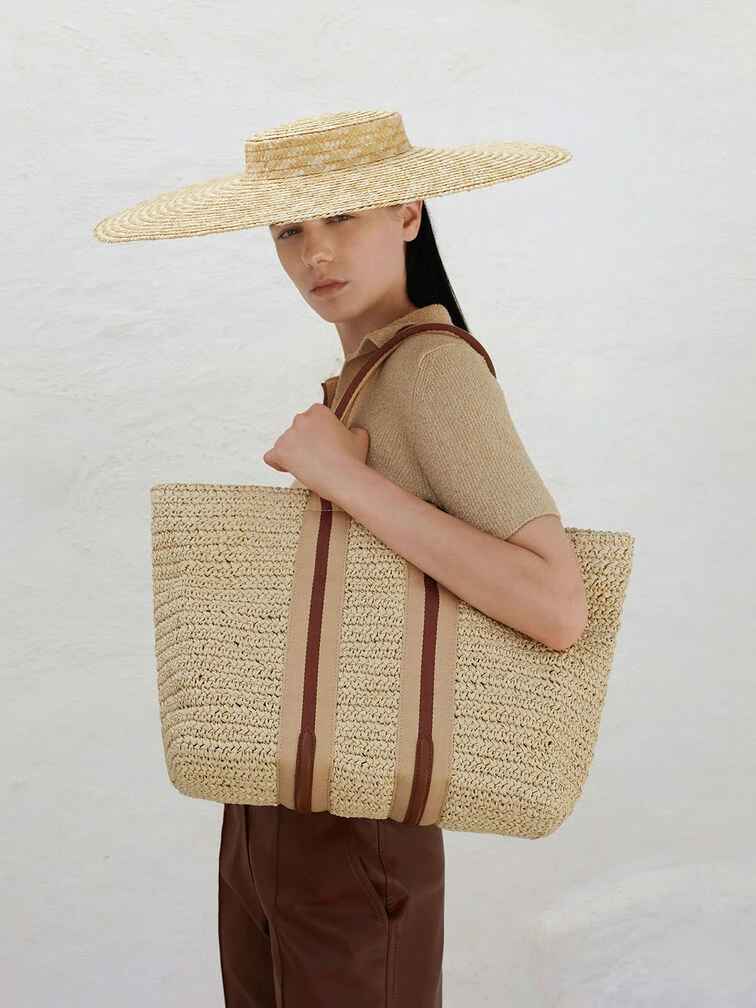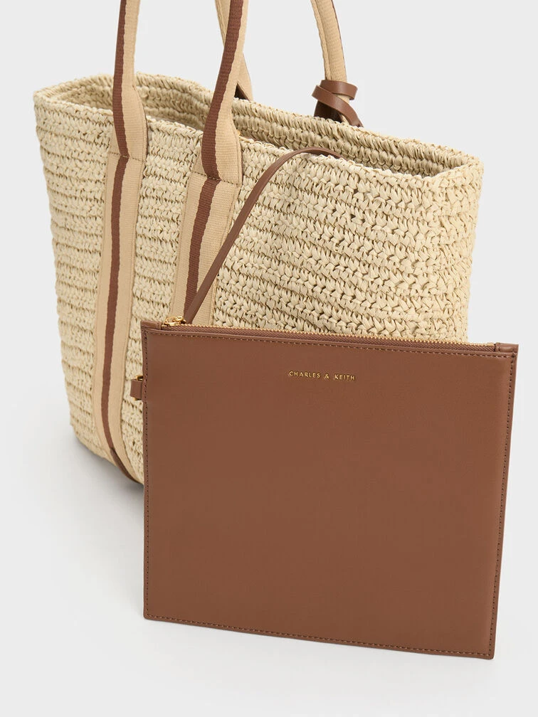 From the texturally interesting and tactile raffia finish to the chocolate stripe accent, this version of our striped handles raffia tote bag will complement your neutral-toned outfits perfectly. Featuring a buckle closure that opens up into a spacious interior, this bag has more than enough room to hold everything you need and then some. Bonus points for the inner compartment and detchable pouch to keep your belongings organised.