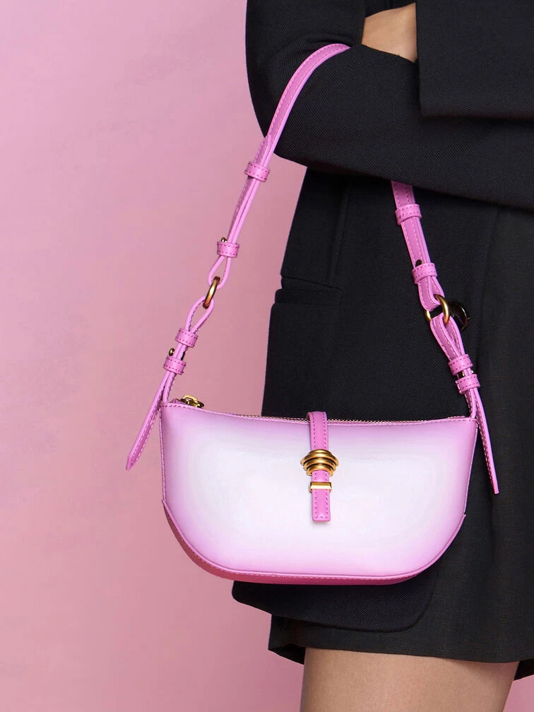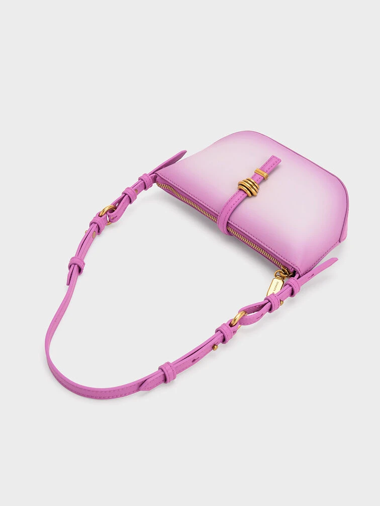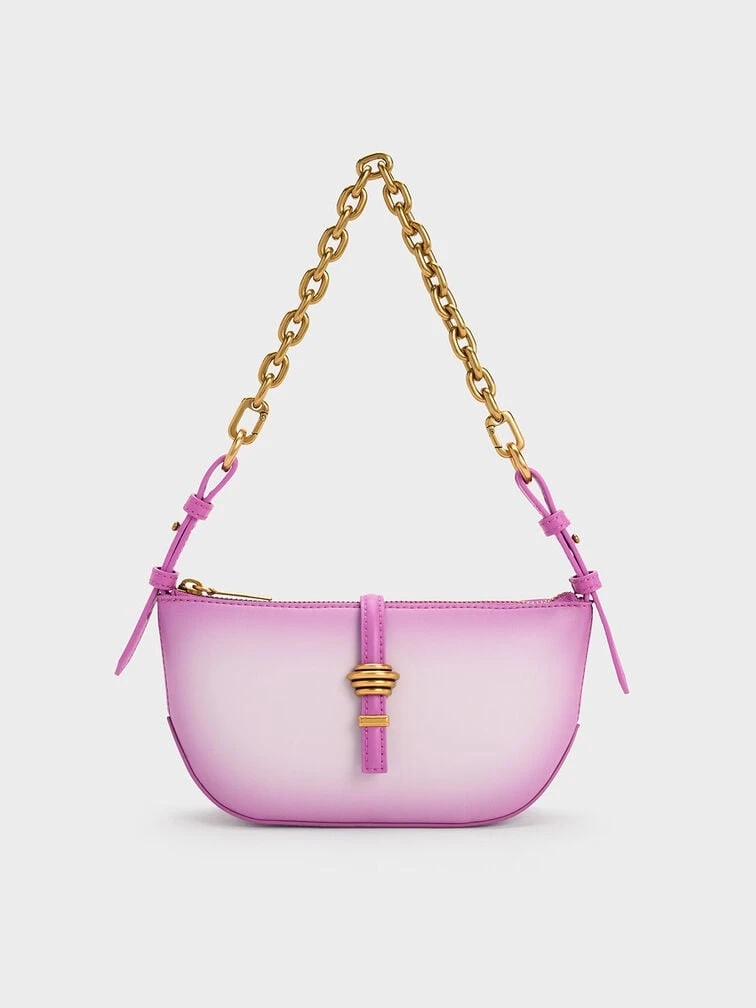 Add a fashionable flair to your date night ensembles with the Trudy geometric bag by your side. Featuring a brilliant ombre purple finish, visually striking geometric silhouette, and gorgeous gold-tone hardware, this bag is bound to turn heads wherever you go. Bonus points for the chic chain handle, which adds irresistible shine to this standout accessory. We think this bag will look stunning alongside a tube top, mini skirt, and chunky platform boots.